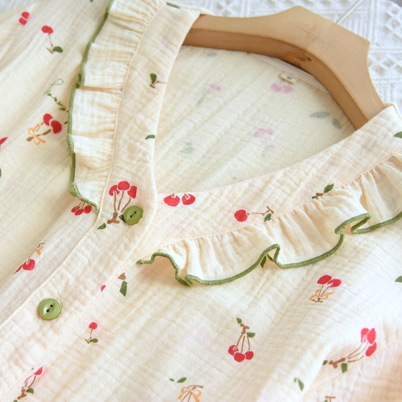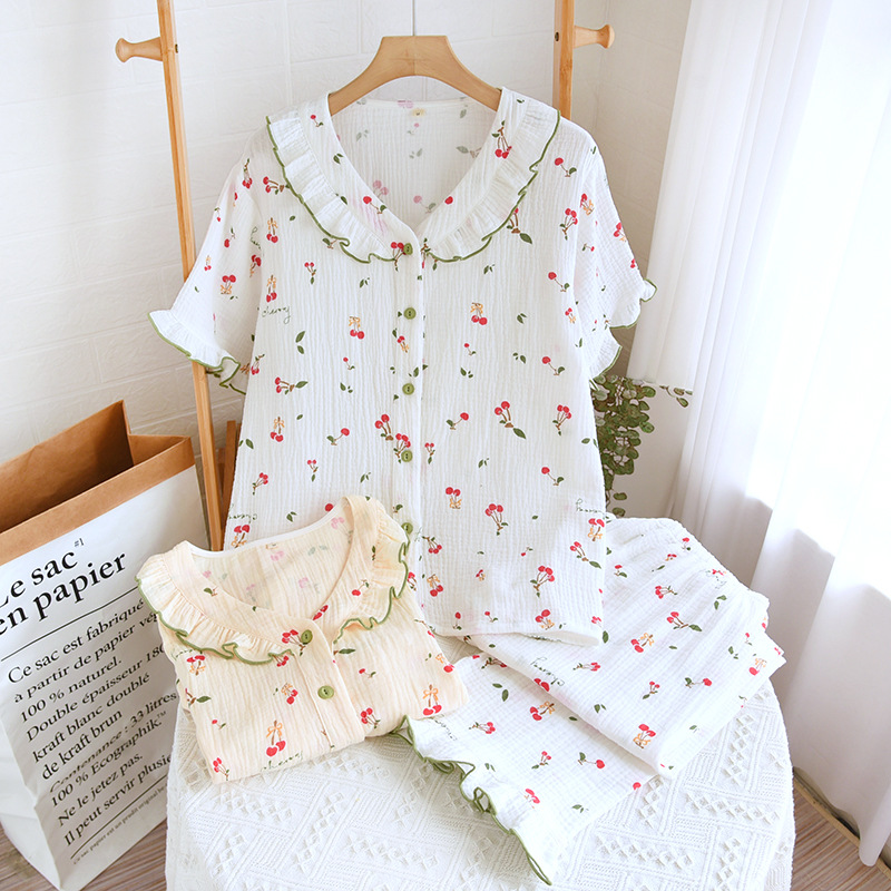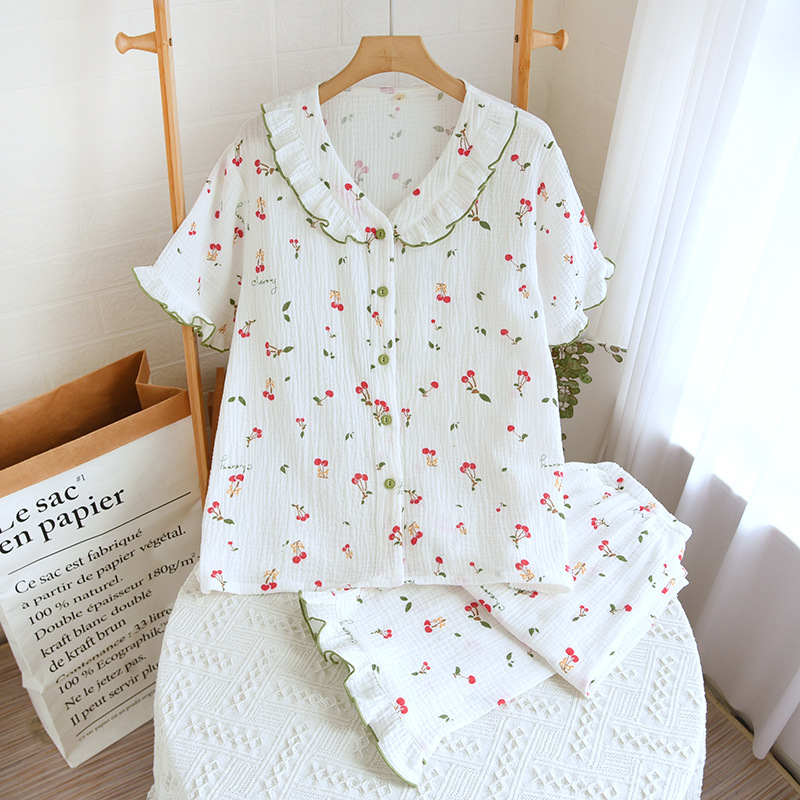여자의 가정 옷 새로운 반팔 바지 면사 달콤한 체리 여름 느슨한 잠옷 세트 편안한 면 홈스토어 가기