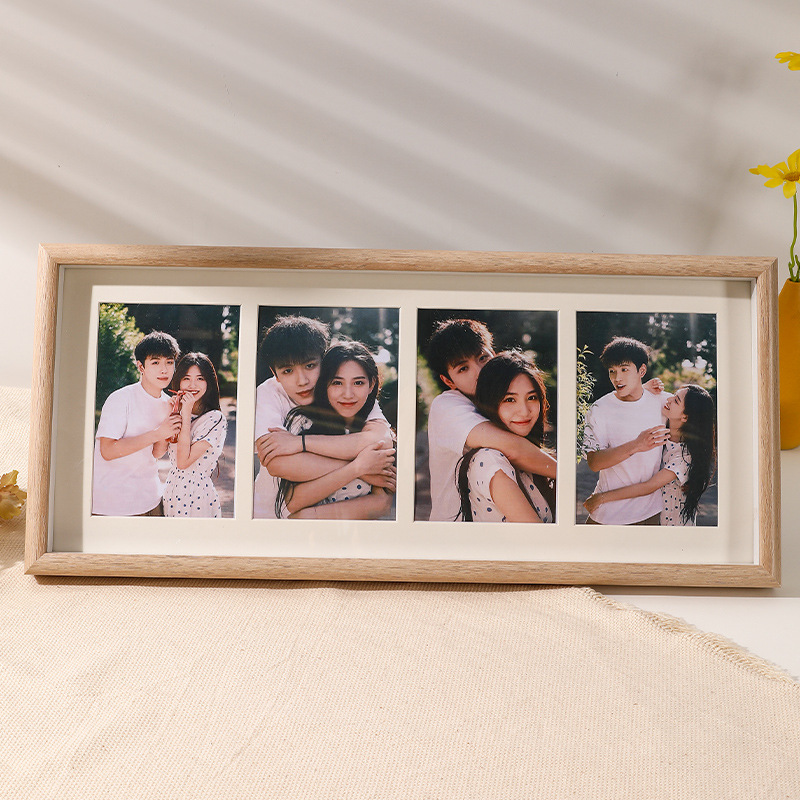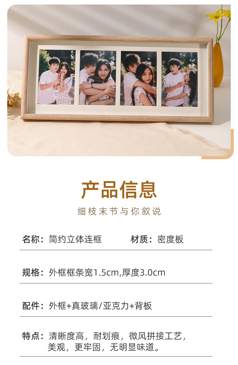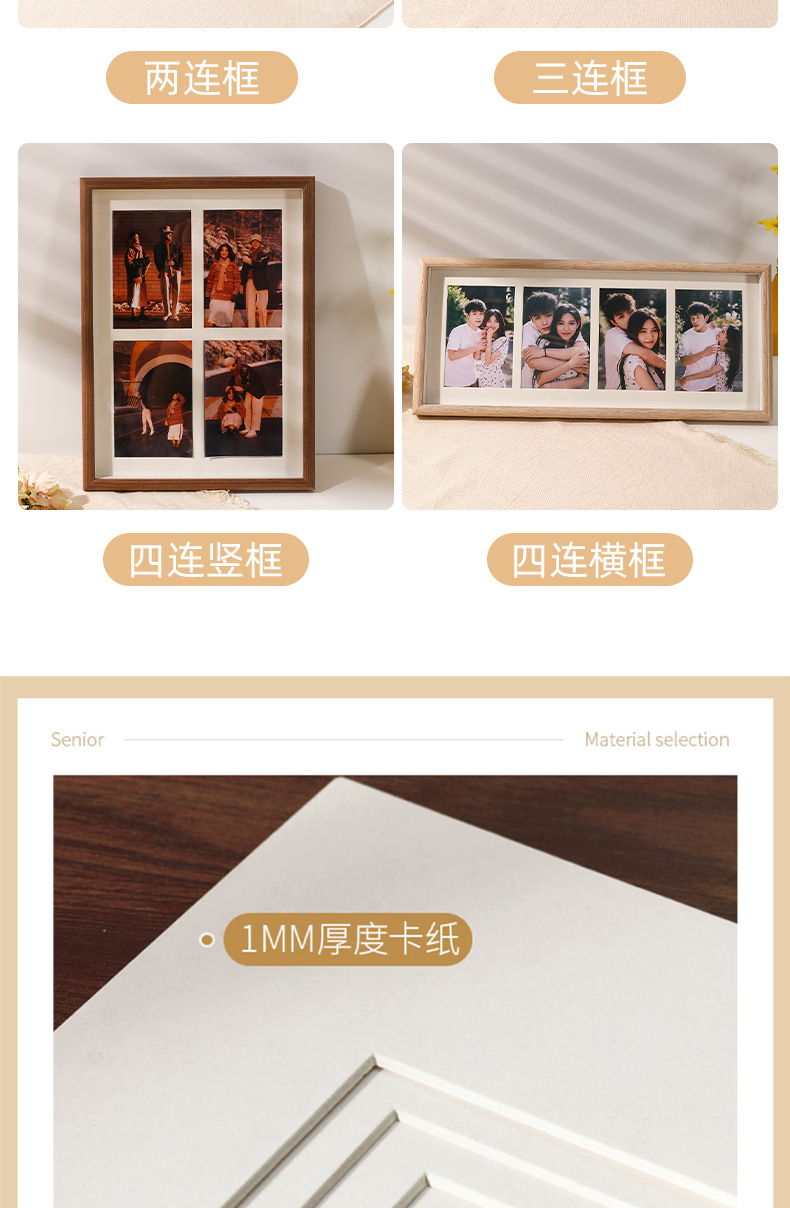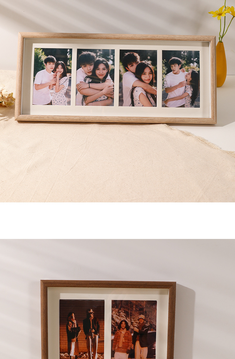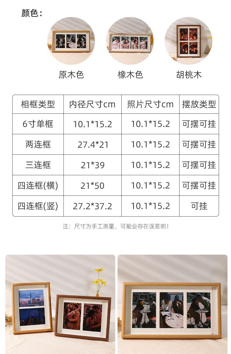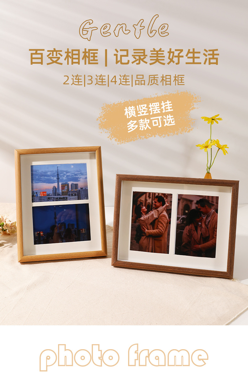 此链接相框规格都是放6寸照片的哈 二连框支架横竖都可以摆 三四连的支架只支持如图所摆 竖过来摆需要靠墙或者靠着物体摆放 照片横竖都可放 6寸照片有过塑或者没修剪白边的可以直接放上去 如果修剪的比较赶紧并且没过塑可能需要使用些辅助手段固定在卡纸上哈 介意者慎拍 有问题可以第一时间联系客服 6寸单框不能装过塑的照片 只能装常规6寸照片哦 切记