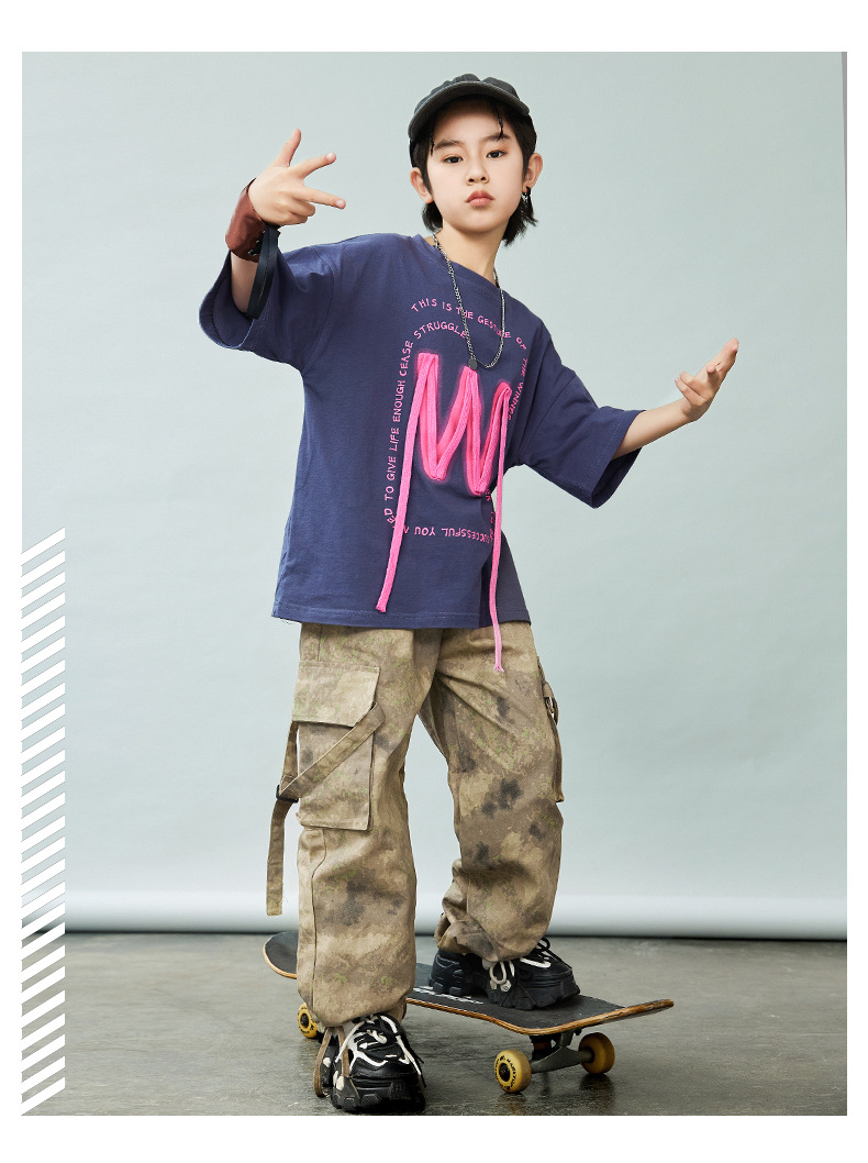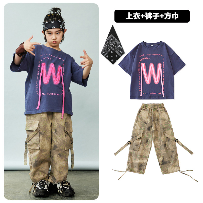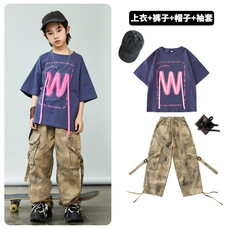 어린이 힙합 패션 의류 소년 보라색 반팔 위장 바지 세트 소녀 힙합 아동복 어린이 6 월 1 일 공연복