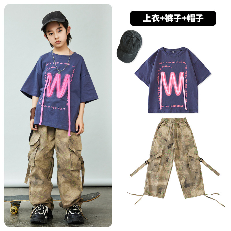 어린이 힙합 패션 의류 소년 보라색 반팔 위장 바지 세트 소녀 힙합 아동복 어린이 6 월 1 일 공연복스토어 가기