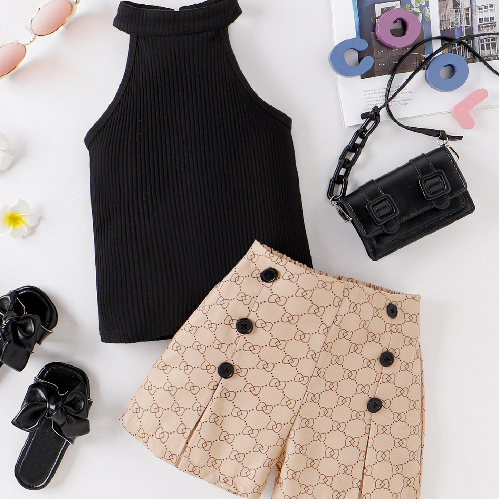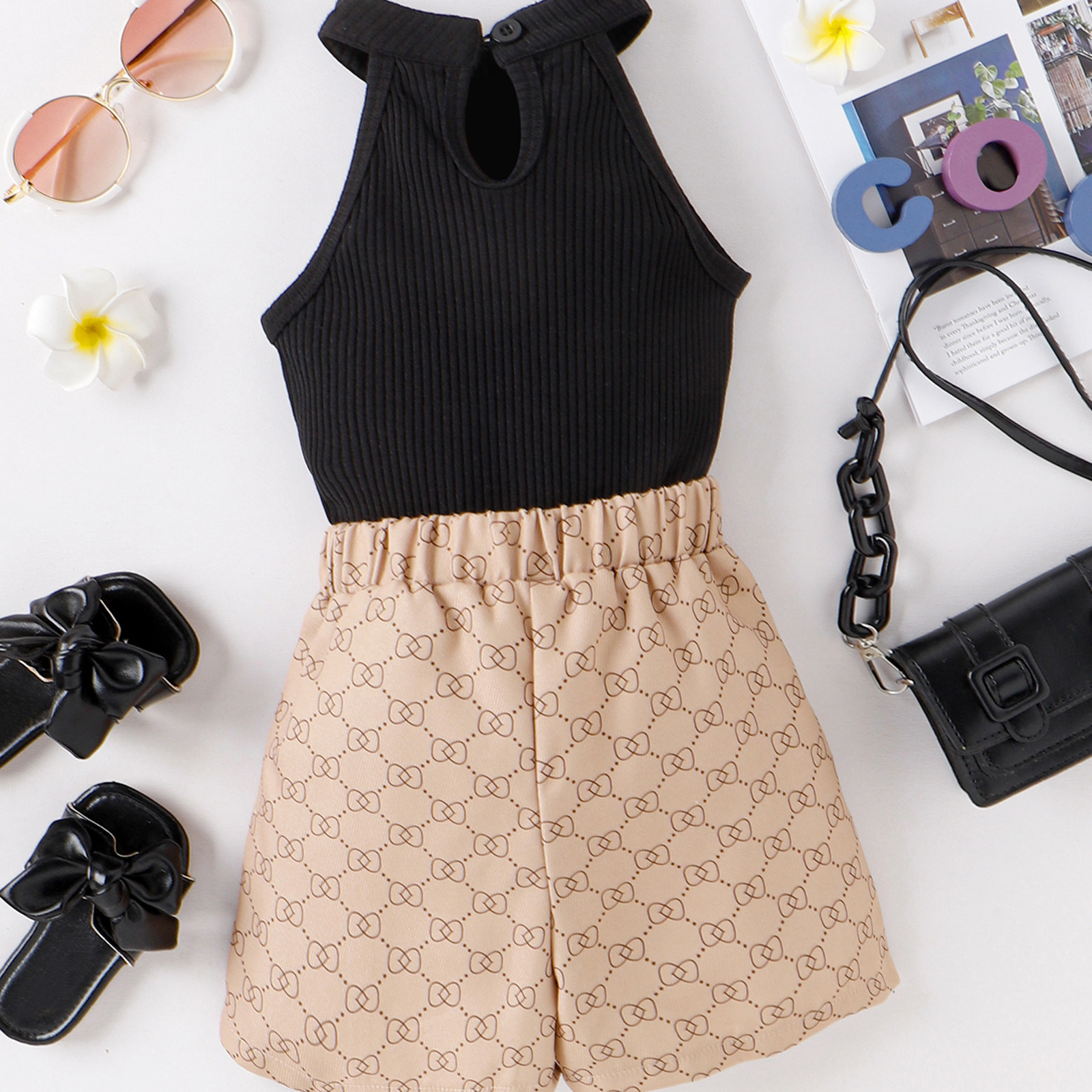 유럽과 미국 아동복 여아 블랙 넥 탑 살구색 프린트 반바지 세트 아기 소녀의 조끼 샤넬 스타일 착용스토어 가기