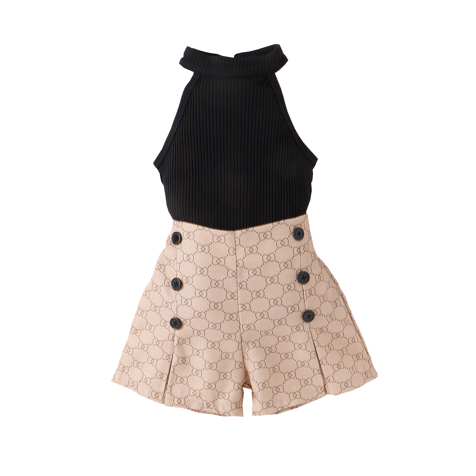 유럽과 미국 아동복 여아 블랙 넥 탑 살구색 프린트 반바지 세트 아기 소녀의 조끼 샤넬 스타일 착용