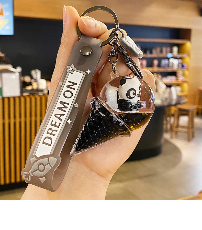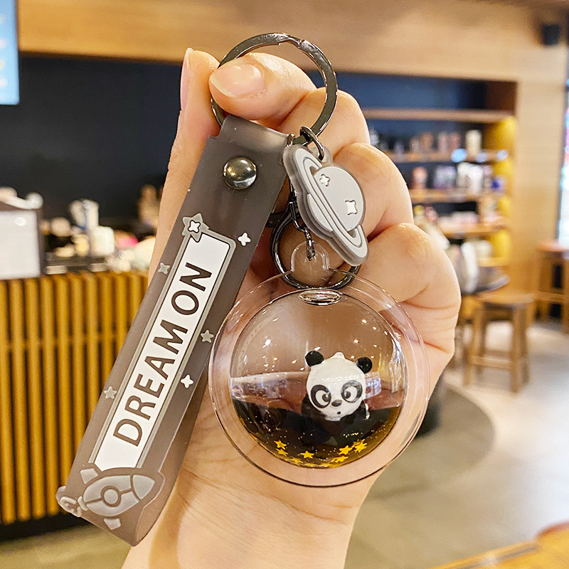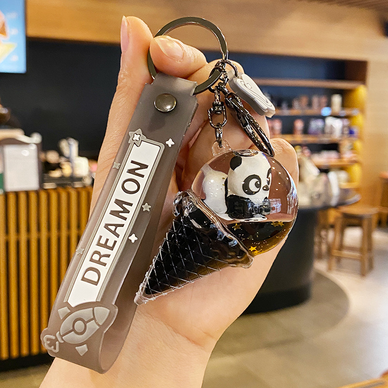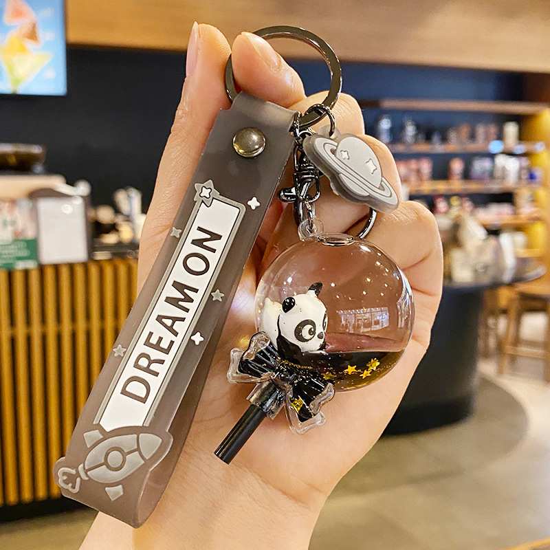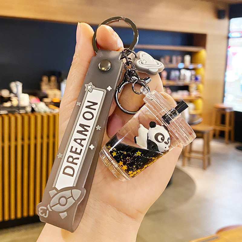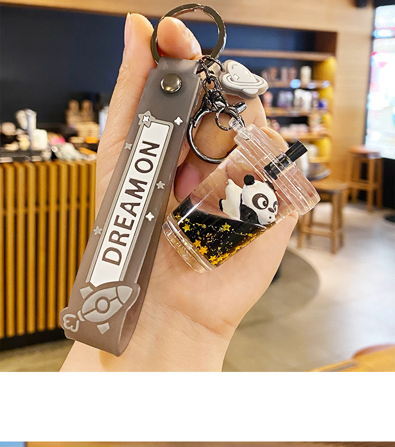 귀여운 자이언트 팬더 기름이 채워진 우유 차 컵 모래 병 열쇠 고리 펜던트 여성의 절묘한 남성과 여성의 책가방 교수형 열쇠 고리