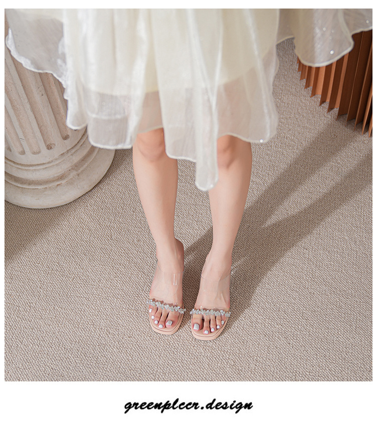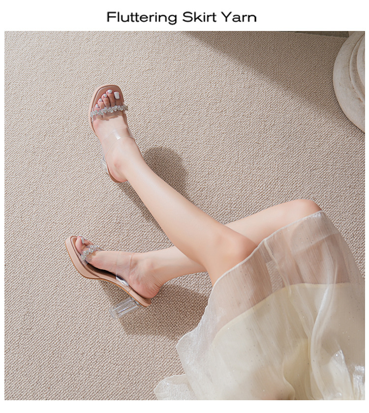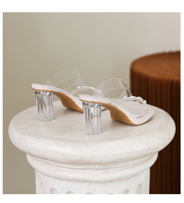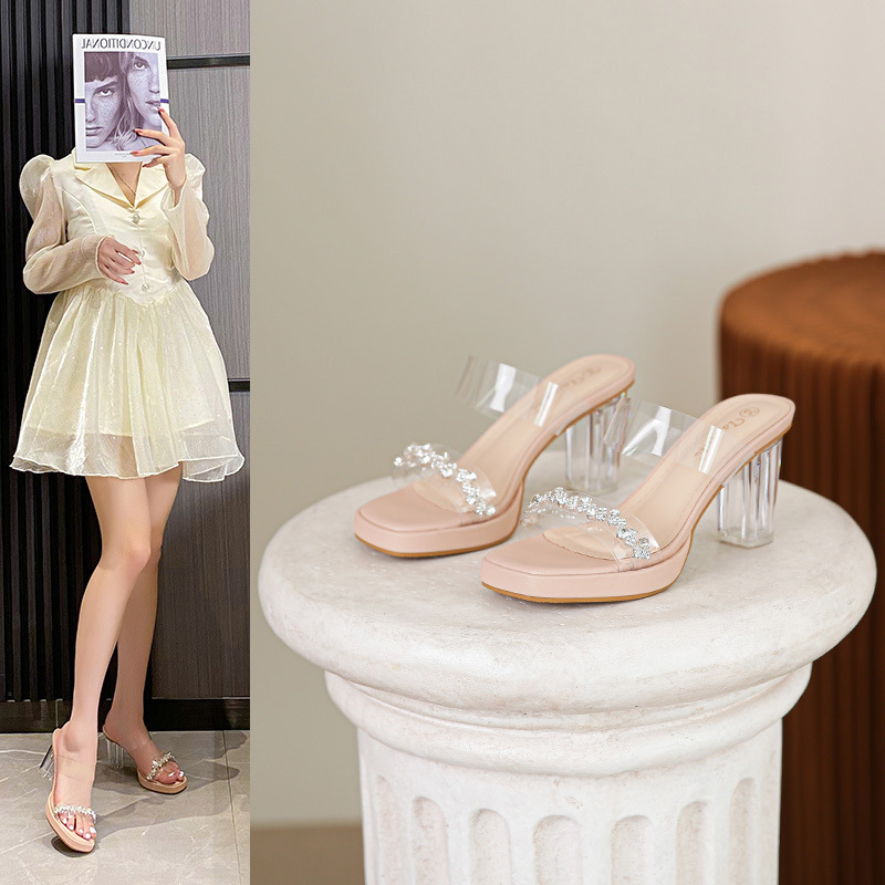 2023 여름 새로운 스타일 슬리퍼 하이힐 방수 플랫폼 크리스탈 두꺼운 굽 중간 굽 스몰 사이즈 투명 샌들 여성용