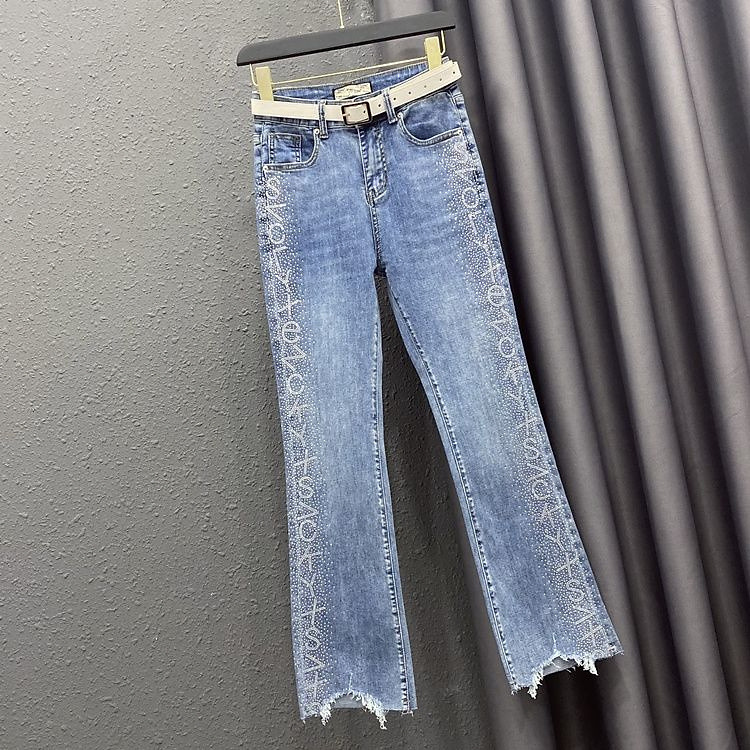 유럽 블루 핫 드릴링 슬림핏 혼 청바지 여성용 2022 여름 새로운 하이 웨이스트 올매치 슬림핏 슬래브스토어 가기