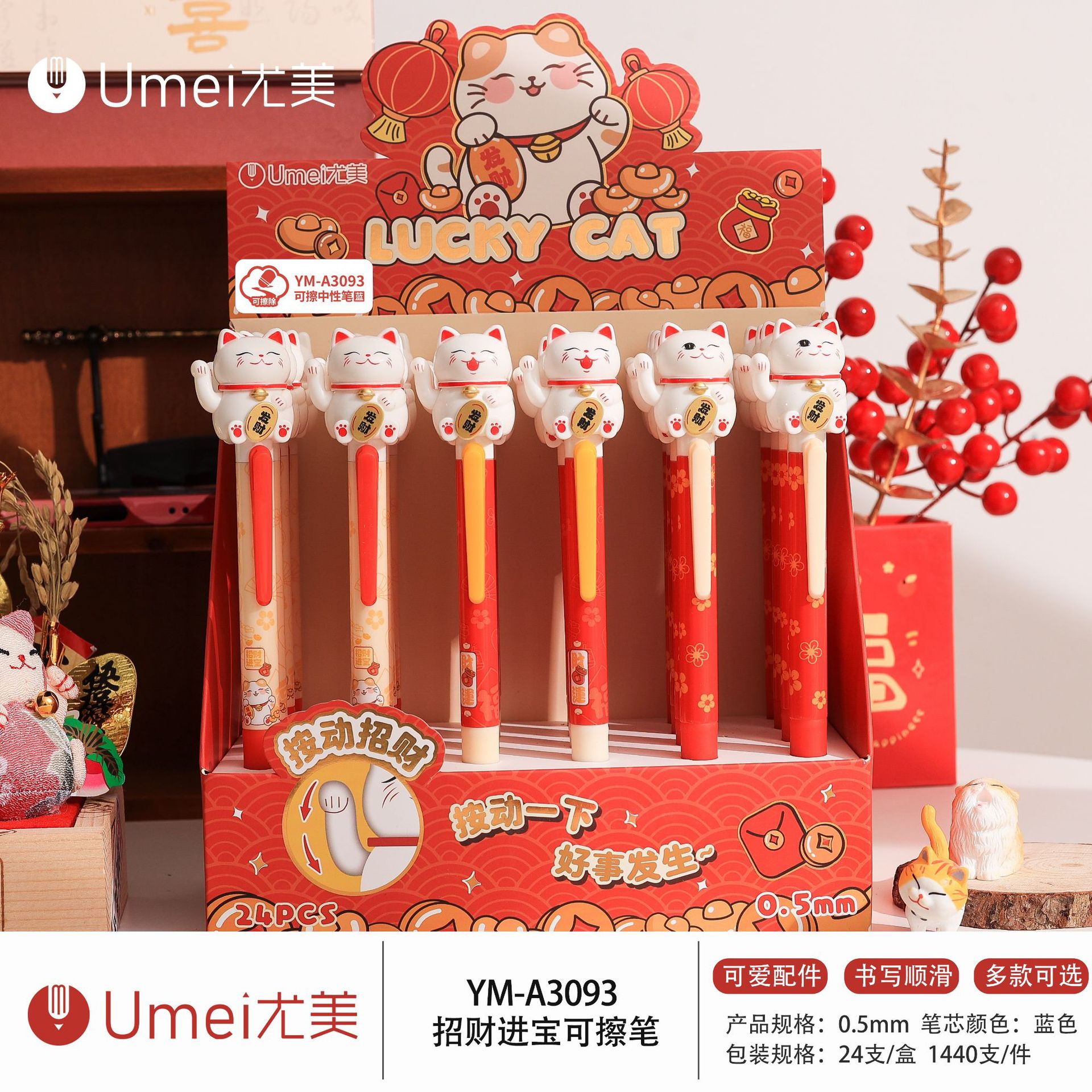 • 블루 YM3300 럭키캣 지울 수 있는 펜 1개 [24개/박스]