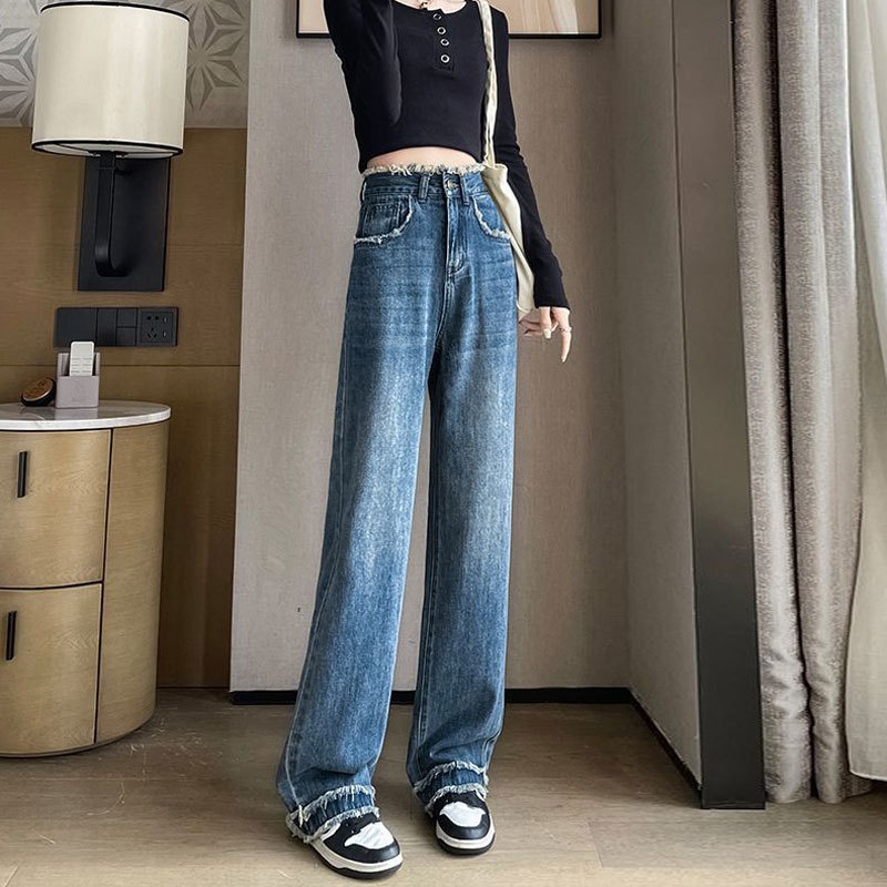 Raw Edge 레트로 청바지 여성용 틈새 스트레이트 캐주얼 느슨한 드레이핑 하이 웨이스트 겉옷 배 모양의 바닥 긴 바지