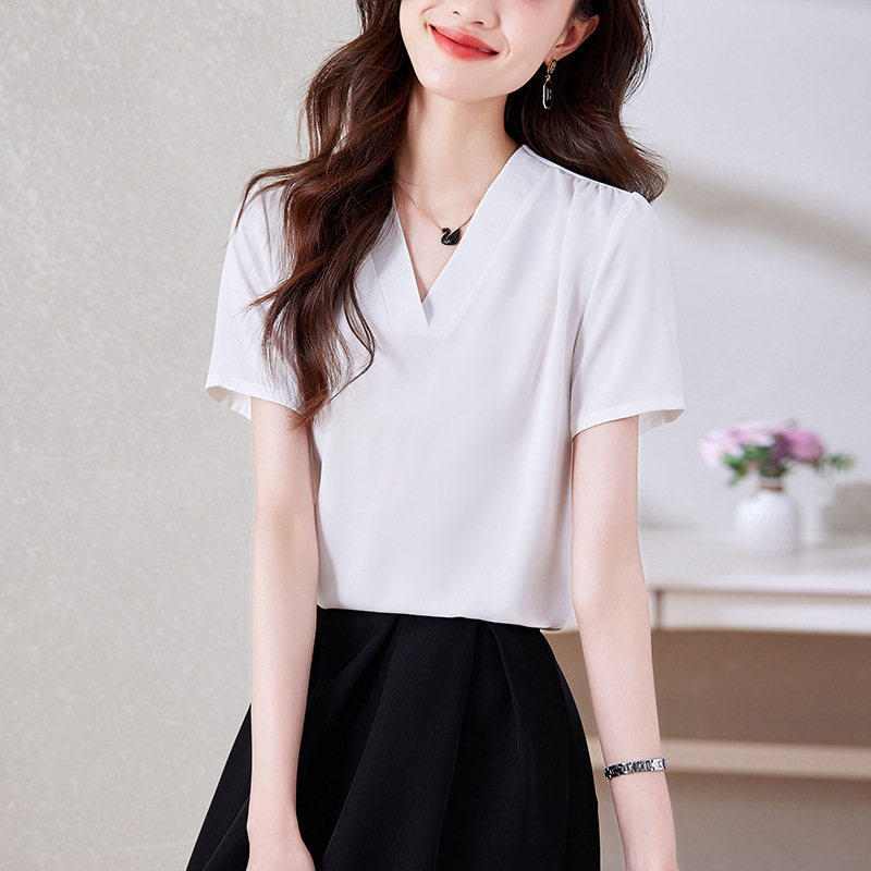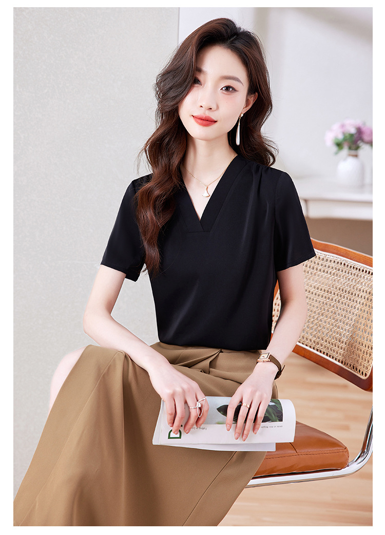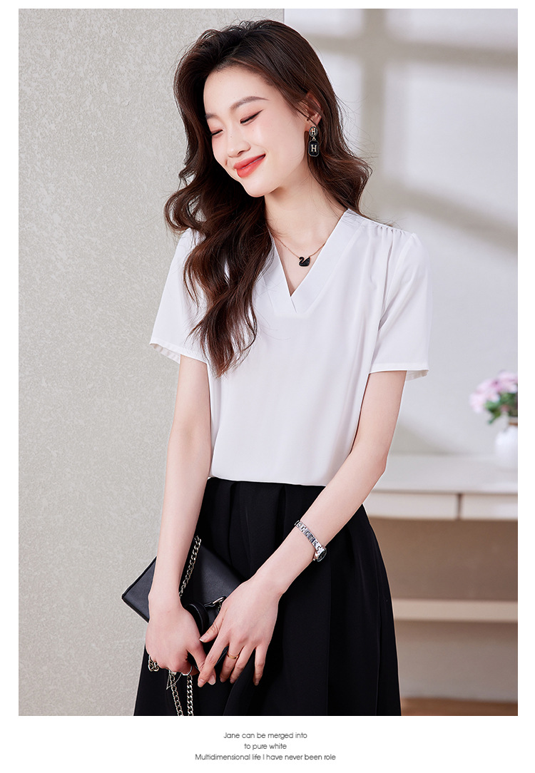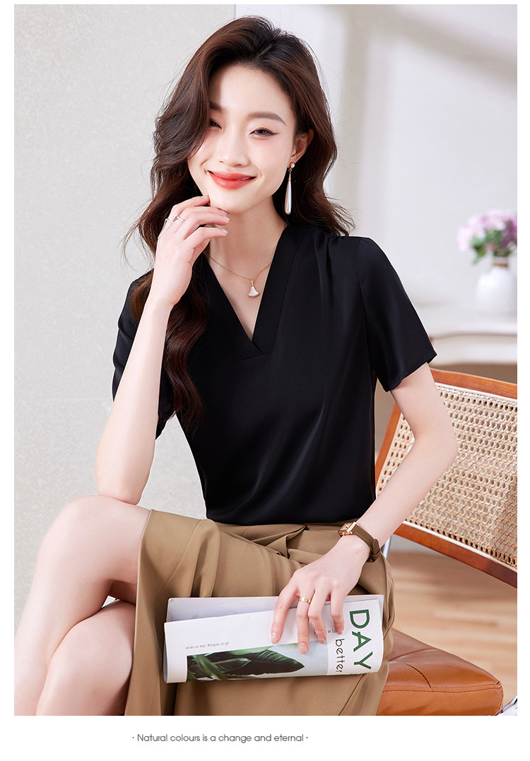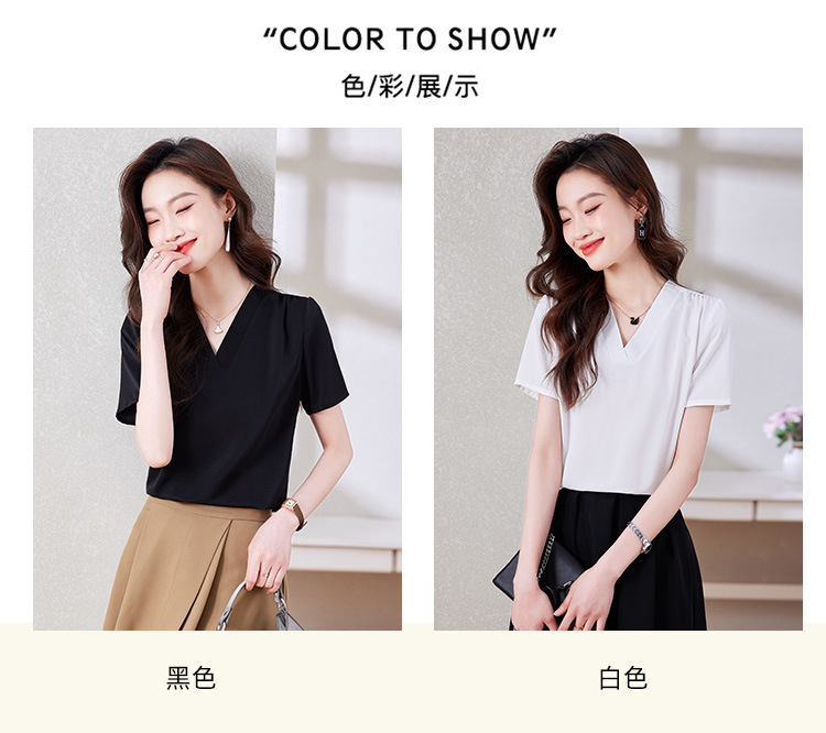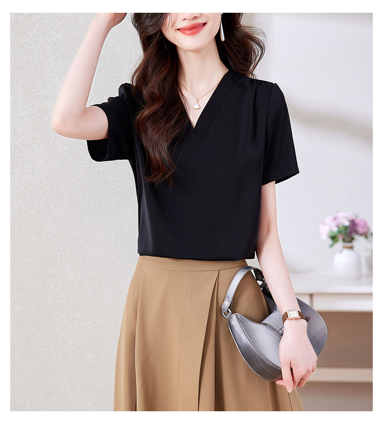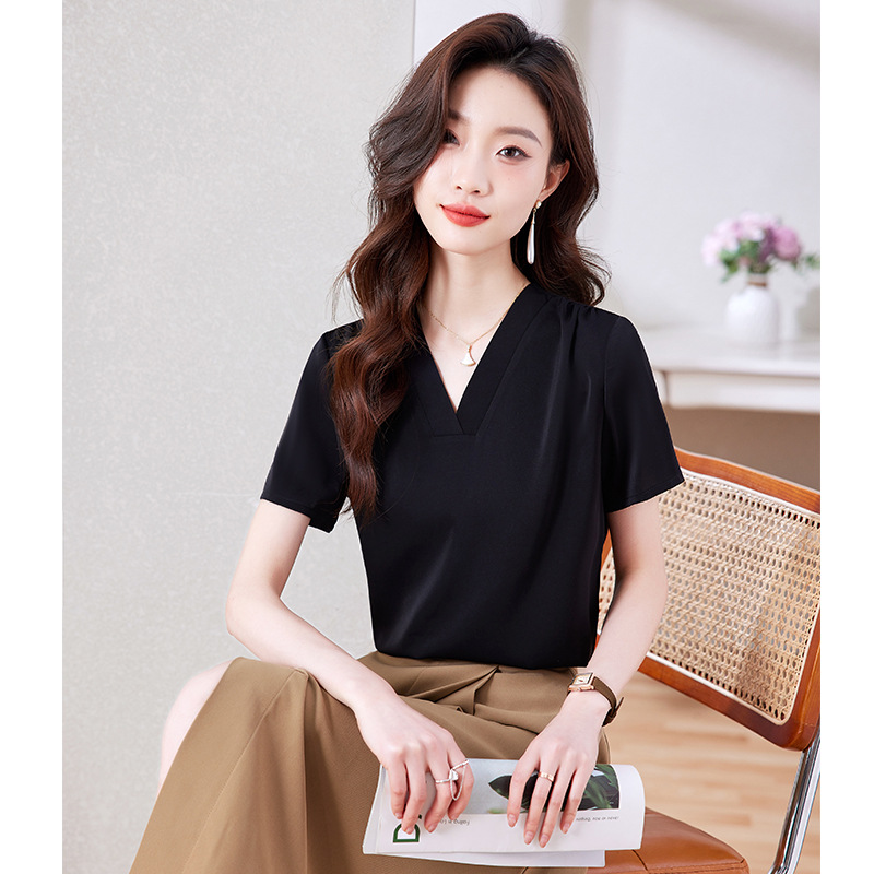 2023 여름 새로운 탑 여성의 심플 뽕나무 실크 단색 플러스 사이즈 V-넥 반팔 티셔츠 시원한 여름스토어 가기