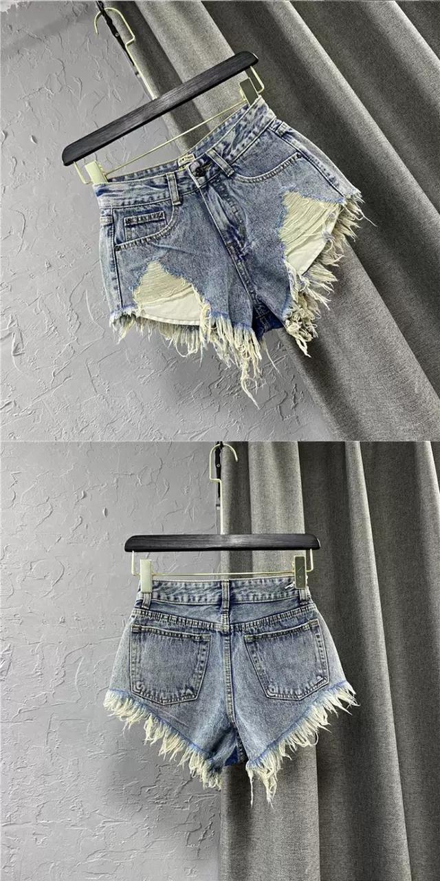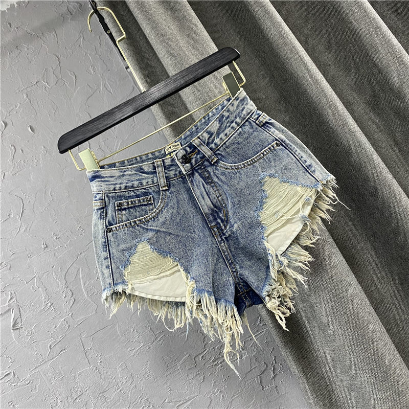 유럽과 미국 여성의 슬림 핏 찢어진 오픈 포켓 술 버 레트로 컬러 데님 반바지 섹시한 낮은 허리 A 라인 핫 팬츠
