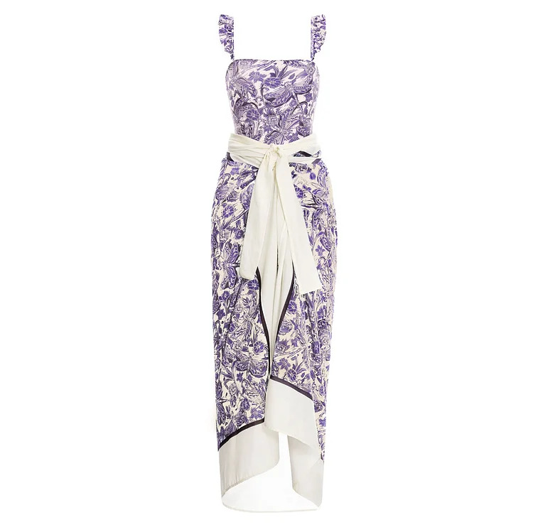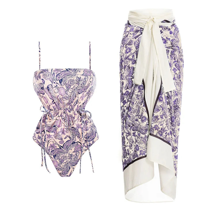 2024 유럽과 미국의 새로운 수영복 미니 러플 퍼플 잠자리 프린트 원피스 수영복 세트 여성용, 해외에서 인기