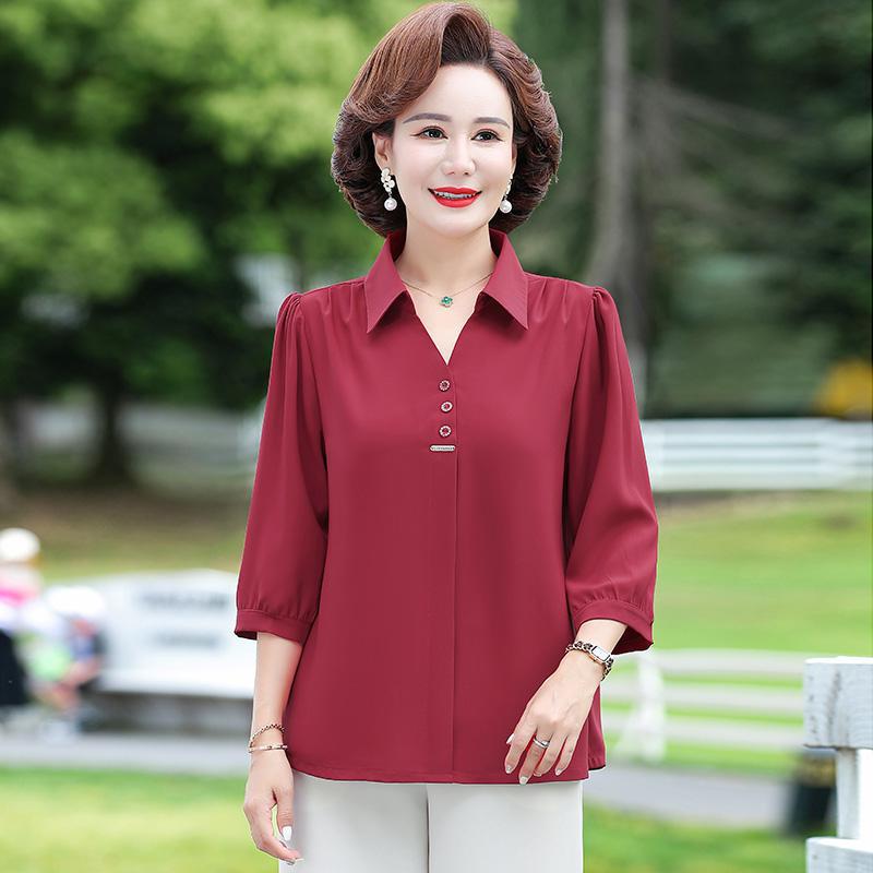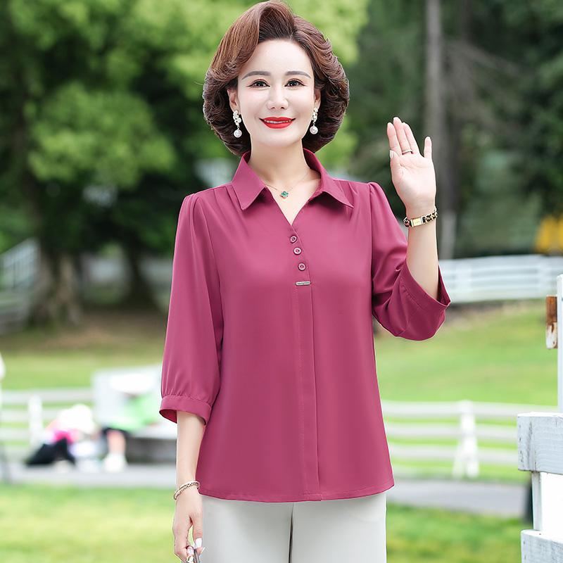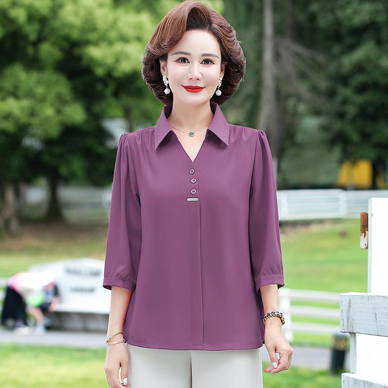 어머니의 봄과 여름 원피스 짧은 얇은 탑, 중년 및 노인 여성 의류 서양식 쉬폰 셔츠 플러스 사이즈 티셔츠스토어 가기
