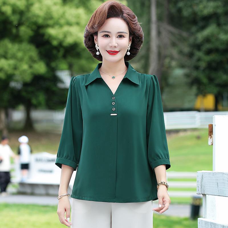 어머니의 봄과 여름 원피스 짧은 얇은 탑, 중년 및 노인 여성 의류 서양식 쉬폰 셔츠 플러스 사이즈 티셔츠