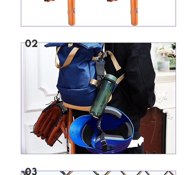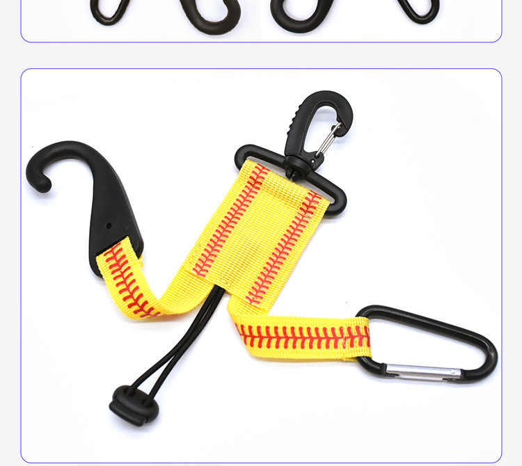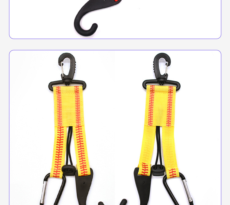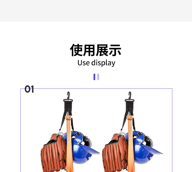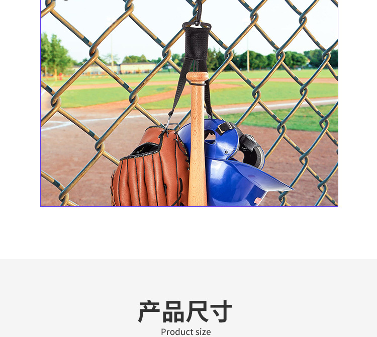 用途:在运动场上,可以轻松的把挂扣挂在栅栏上,用来收纳棒球棍+棒球帽+棒球手套以免放在地上被弄脏或者弄丢。