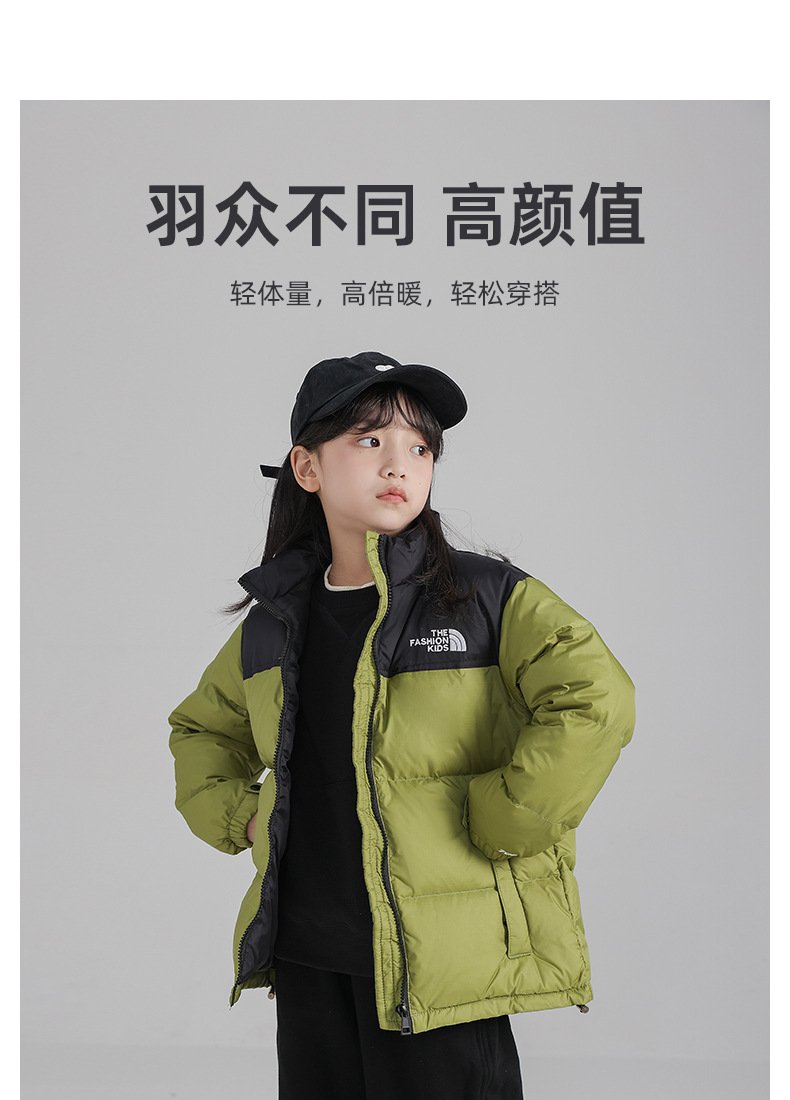 어린이용 다운 재킷 2025 신상 남아 여아 중대형 어린이용 배색 두꺼운 후드 짧은 스타일 흰색 오리털 겨울 코트