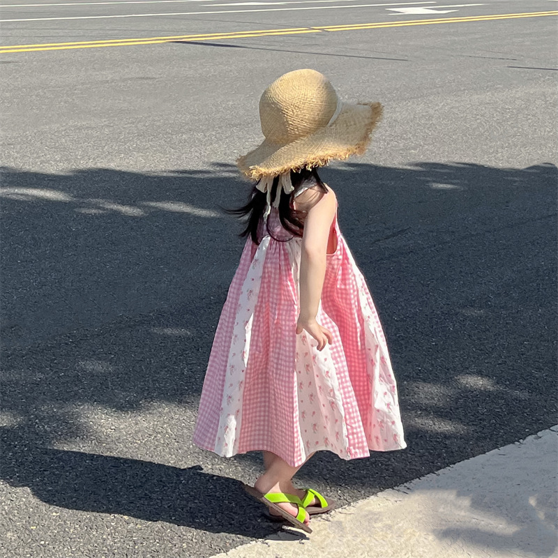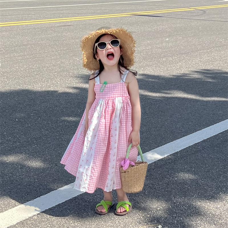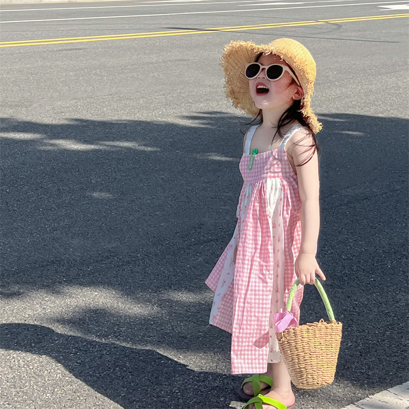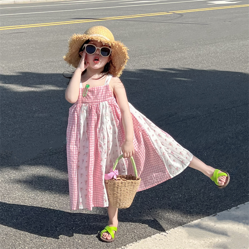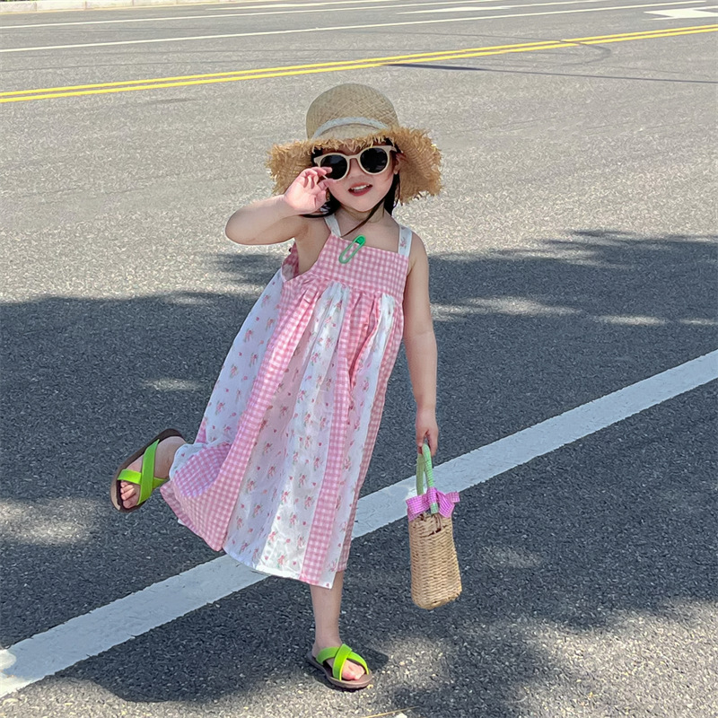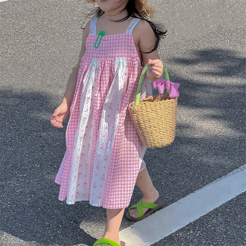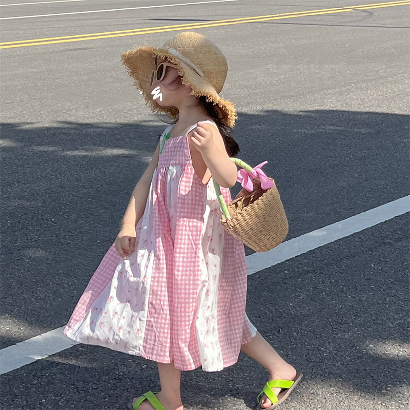 한국 아동복 여아 여름 파우더 격자 무늬 꽃 패치 워크 민소매 세련 대형 슬링 조끼 원피스