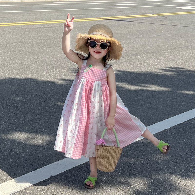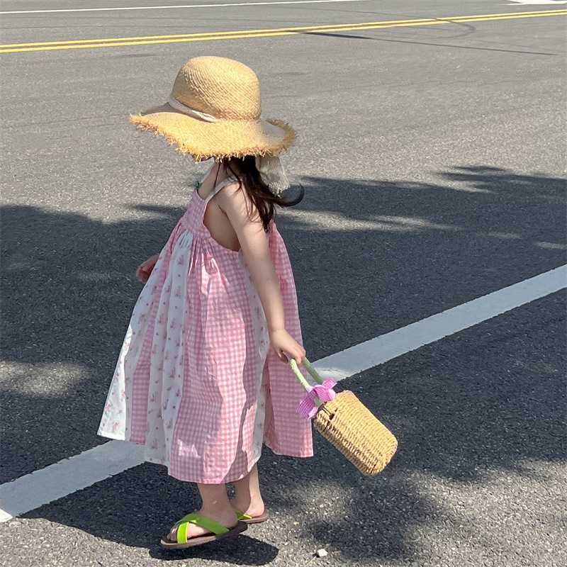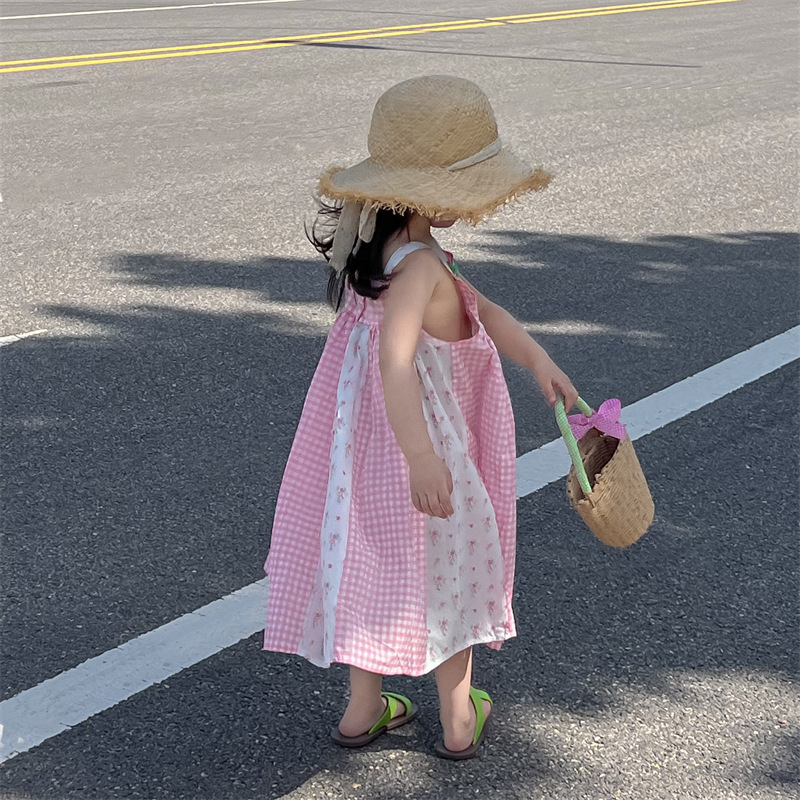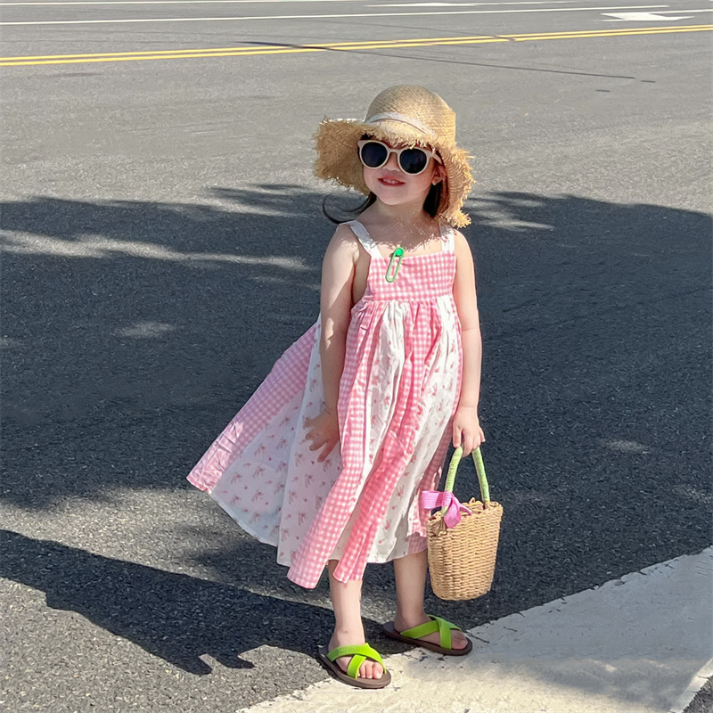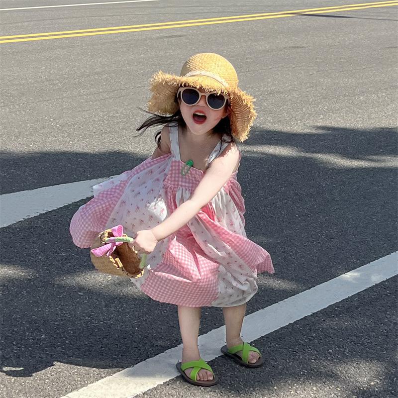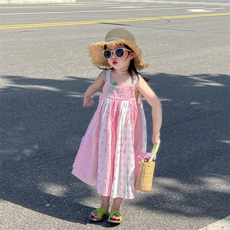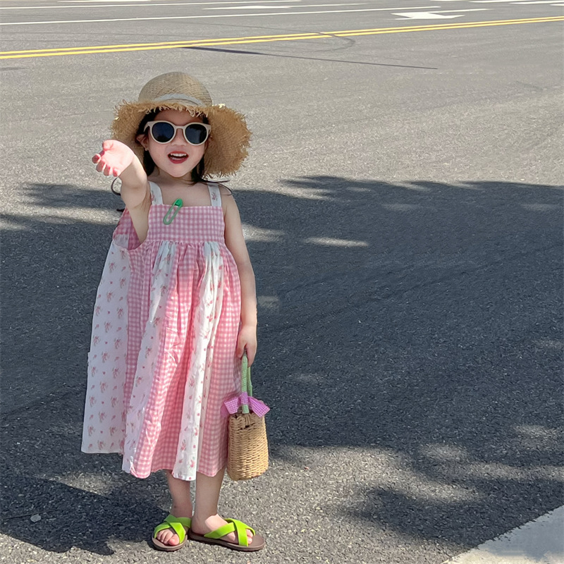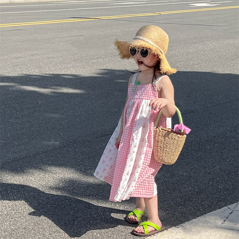 한국 아동복 여아 여름 파우더 격자 무늬 꽃 패치 워크 민소매 세련 대형 슬링 조끼 원피스