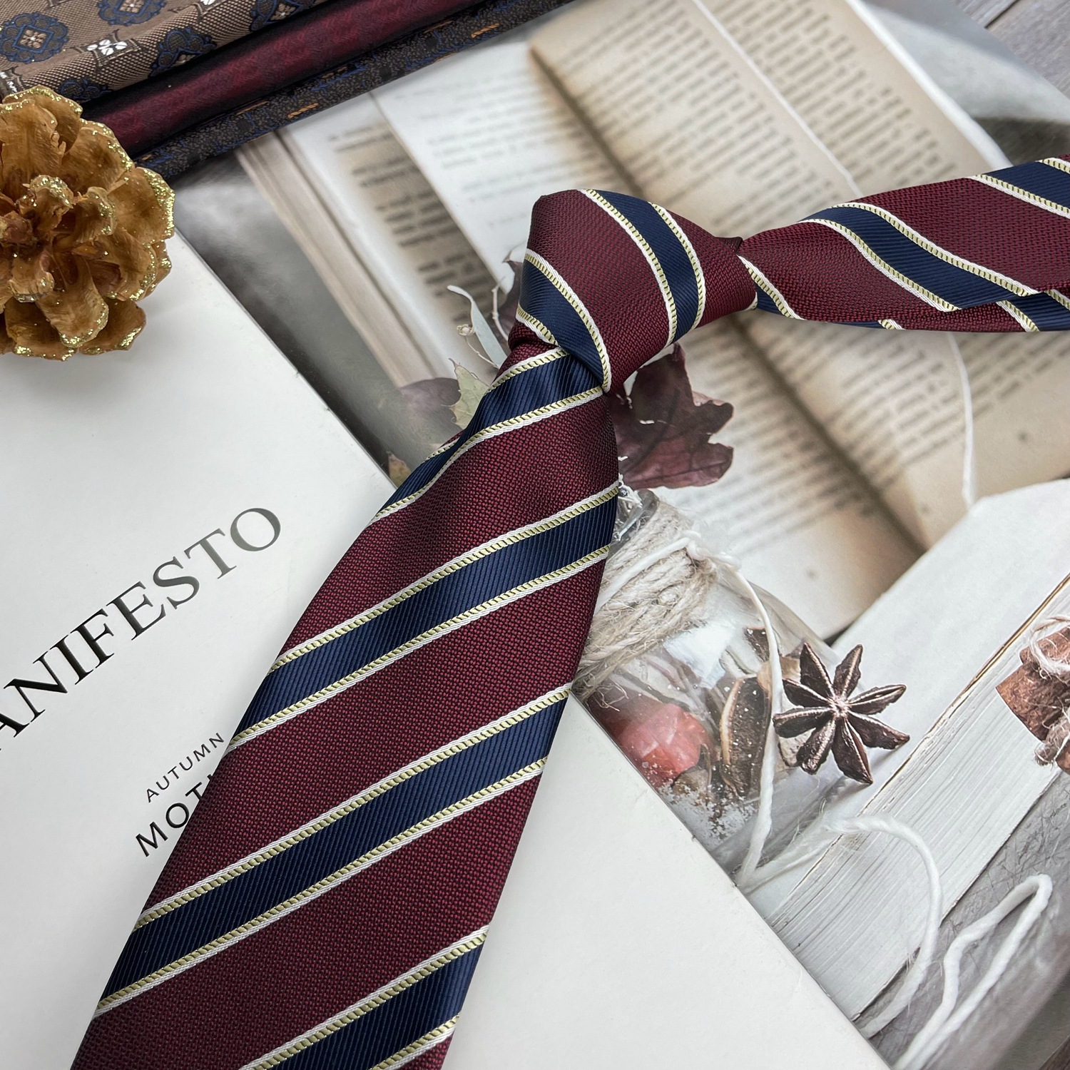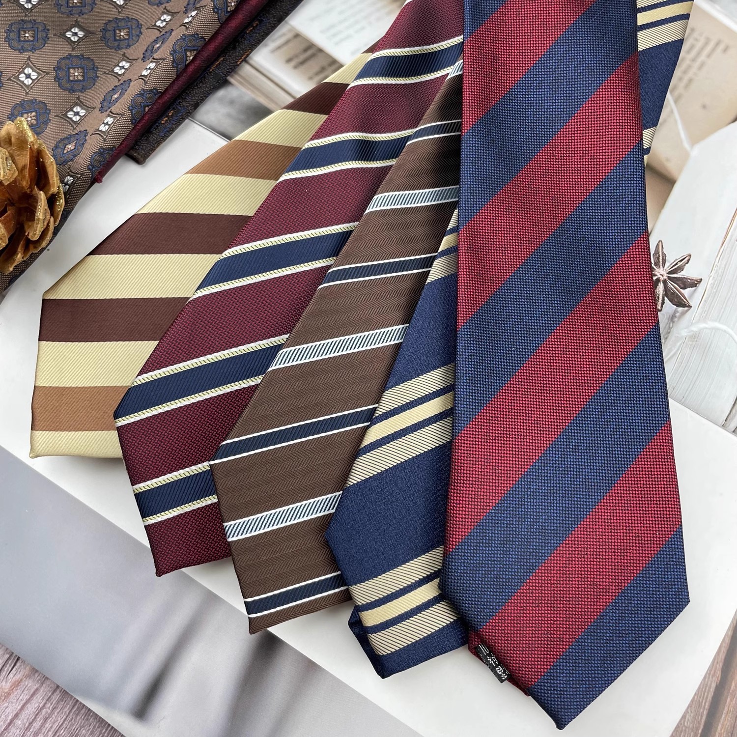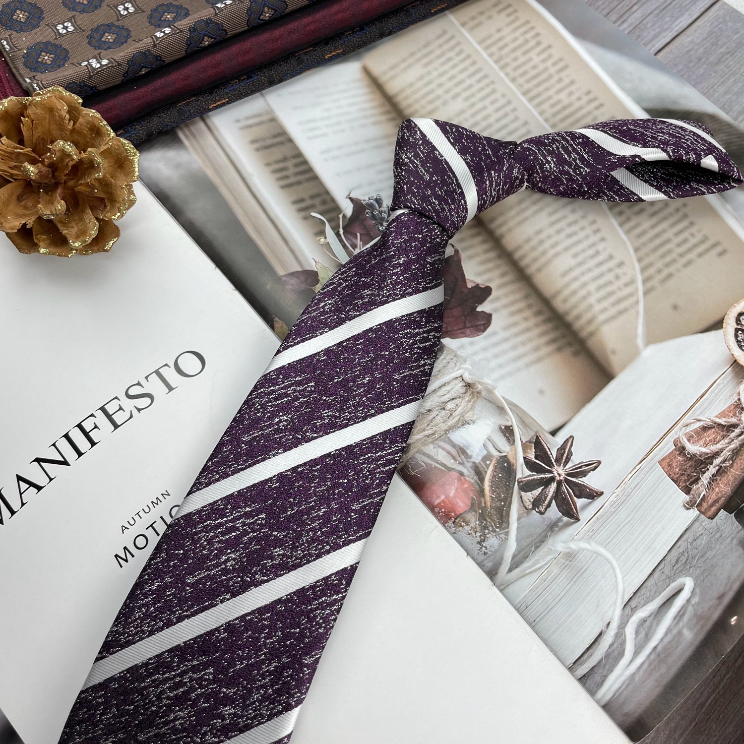 • 버건디 흰색 줄무늬 넥타이 손 * 8cm