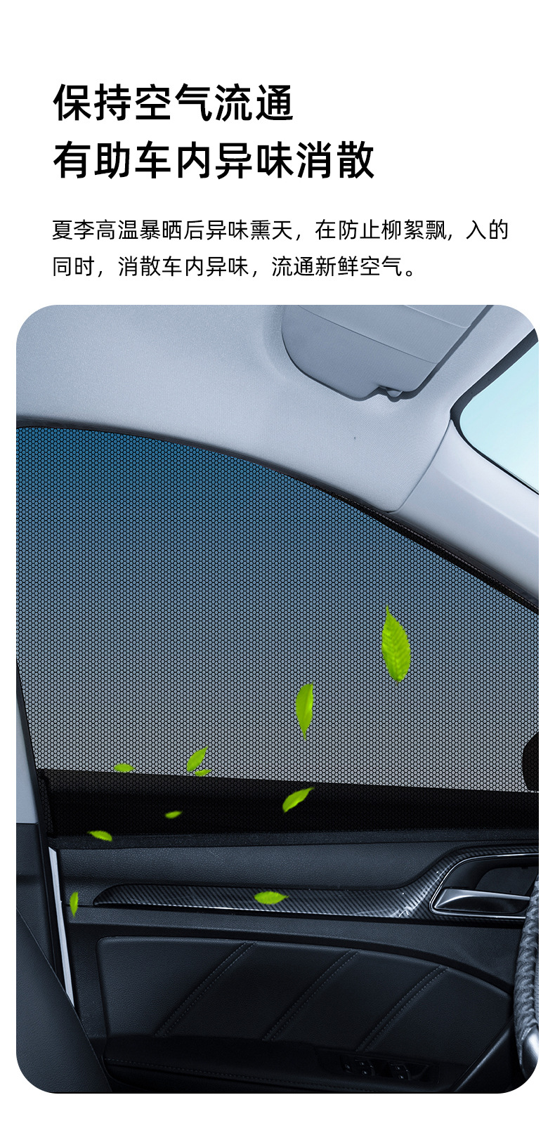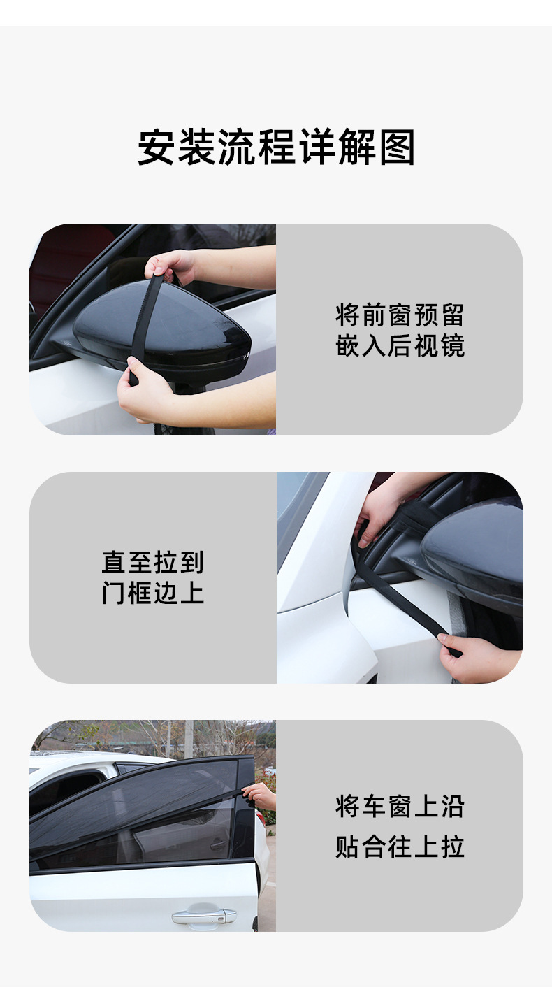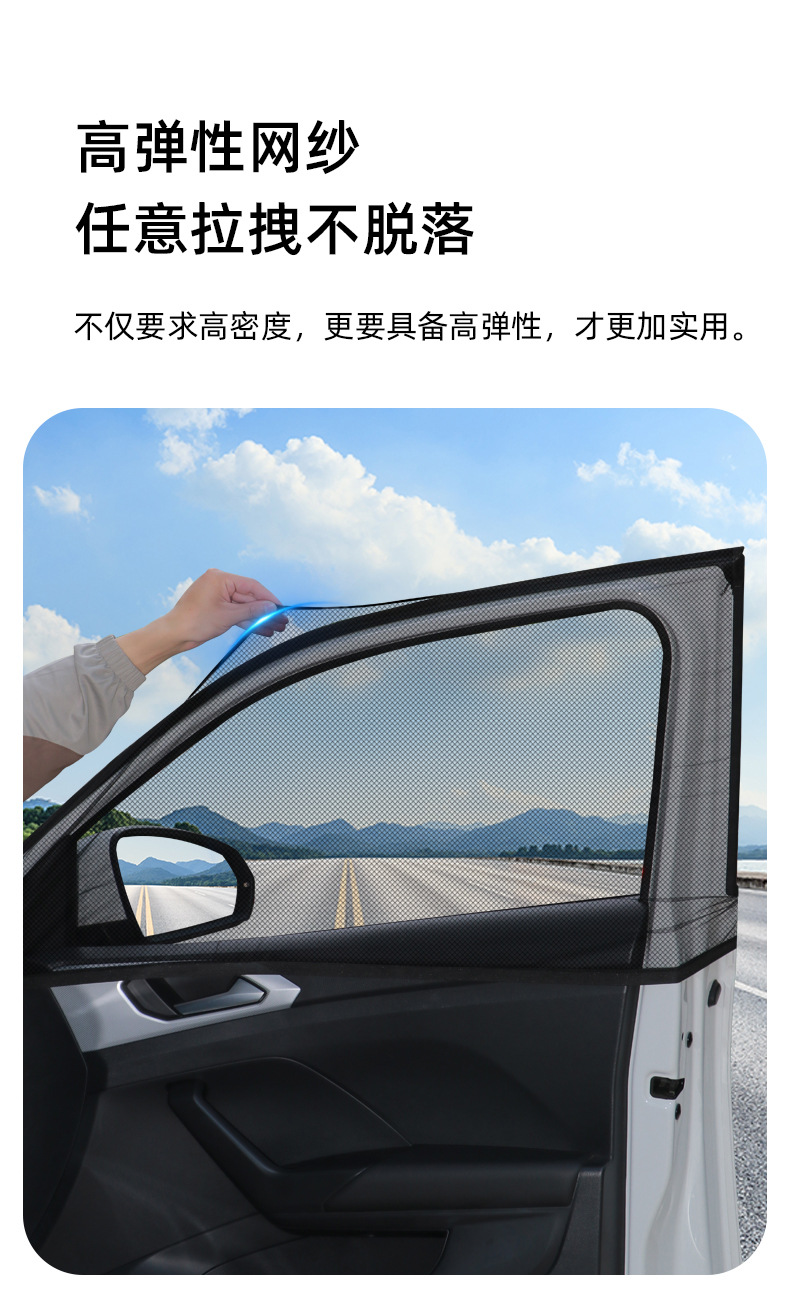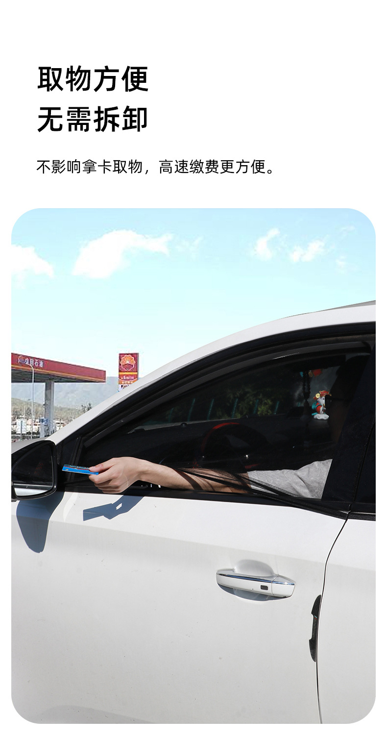 【功能特点】:该产品用于汽车侧车窗遮阳,防蚊,使用时不挡倒车后视镜,不妨碍取卡。