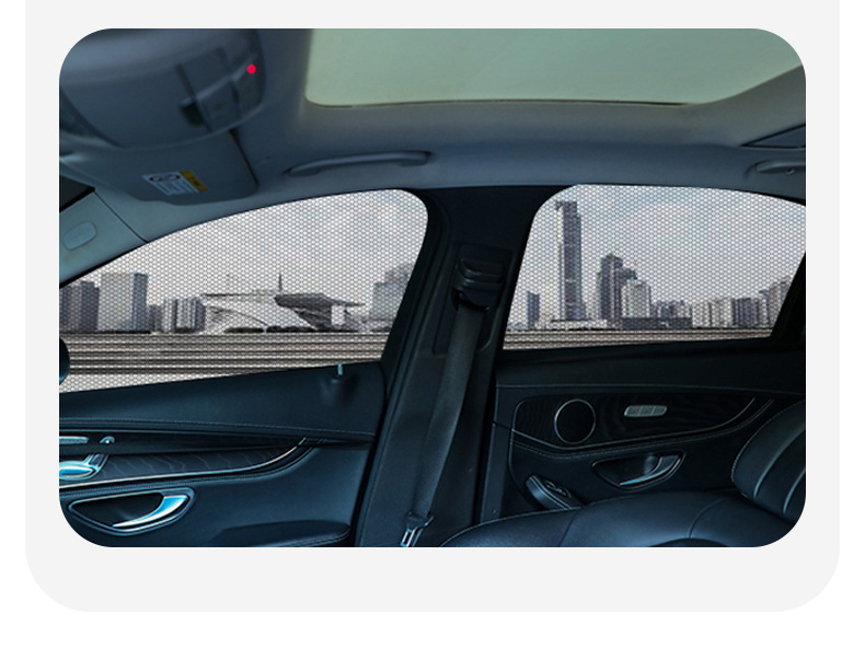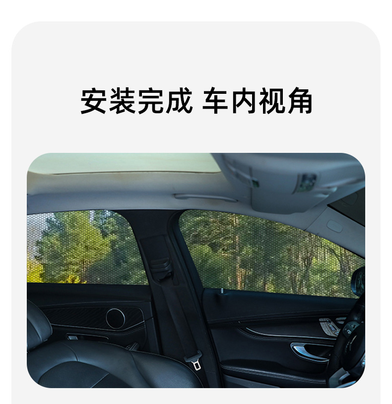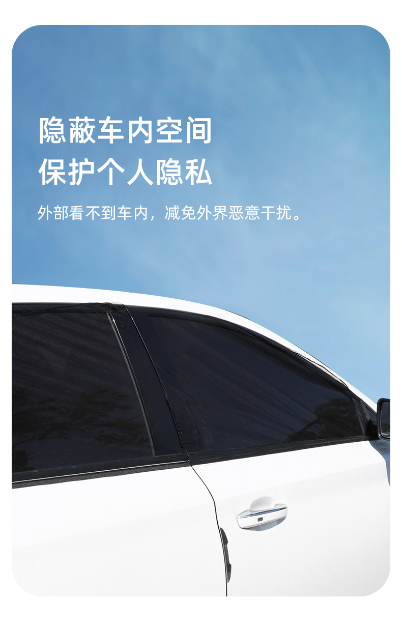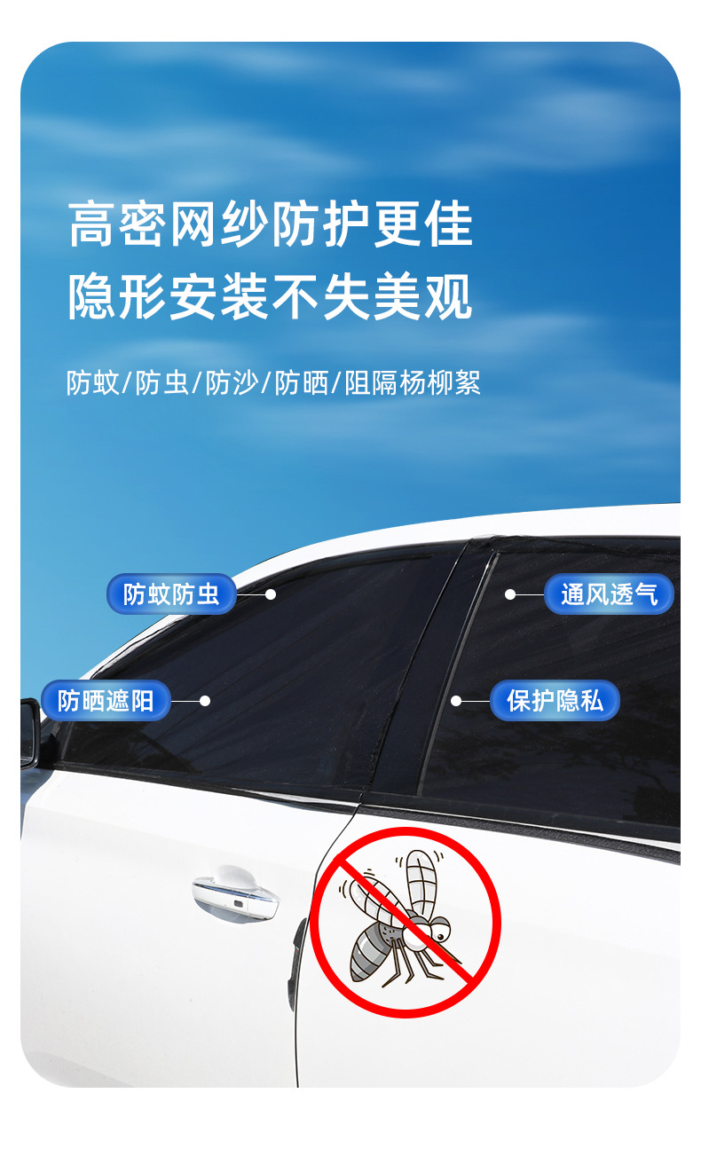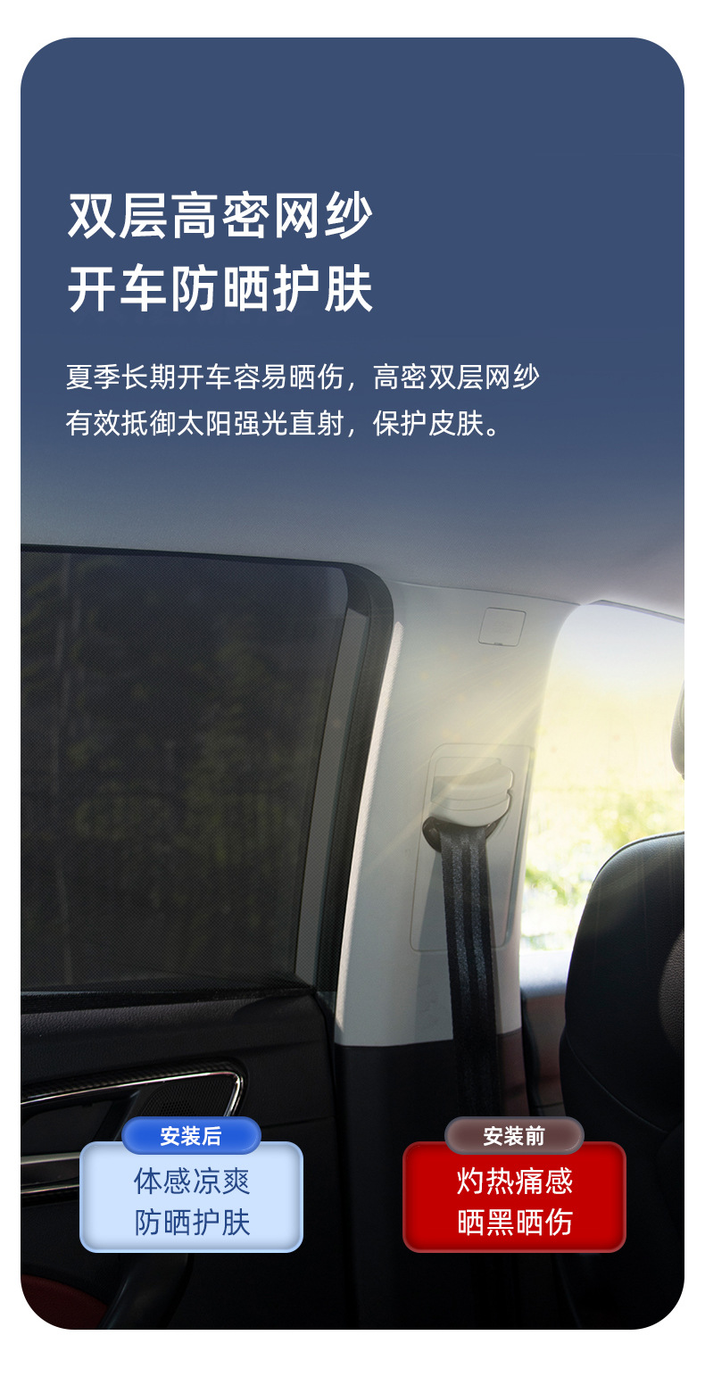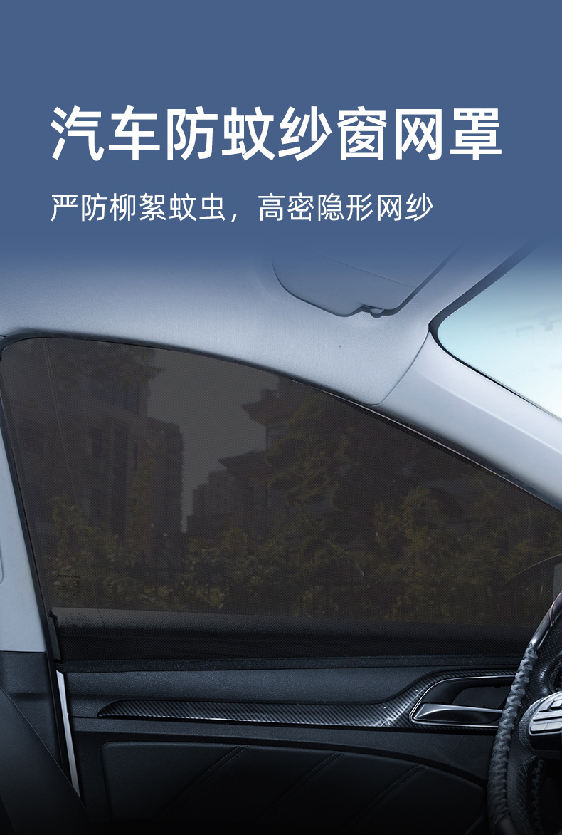 【功能特点】:该产品用于汽车侧车窗遮阳,防蚊,使用时不挡倒车后视镜,不妨碍取卡。