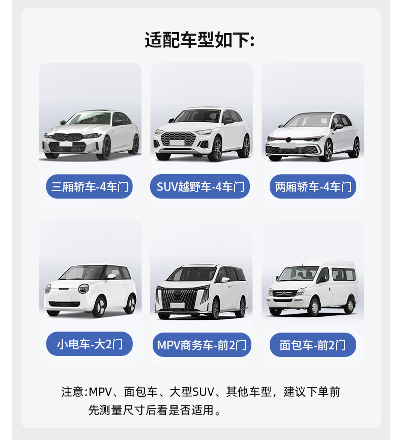 【适用范围】:该产品具备弹性可拉伸长度,故微型小电车、紧凑型车、两厢车、三厢车、SUV车型通用