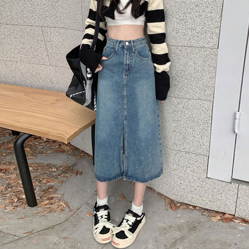 중간 길이 스커트 하프 길이 데님 스커트 여자의 배 모양 사이버 유명 프론트 스플릿 레트로 A-라인 플러스 사이즈 하이 웨이스트 통통녀 힙 스커트스토어 가기