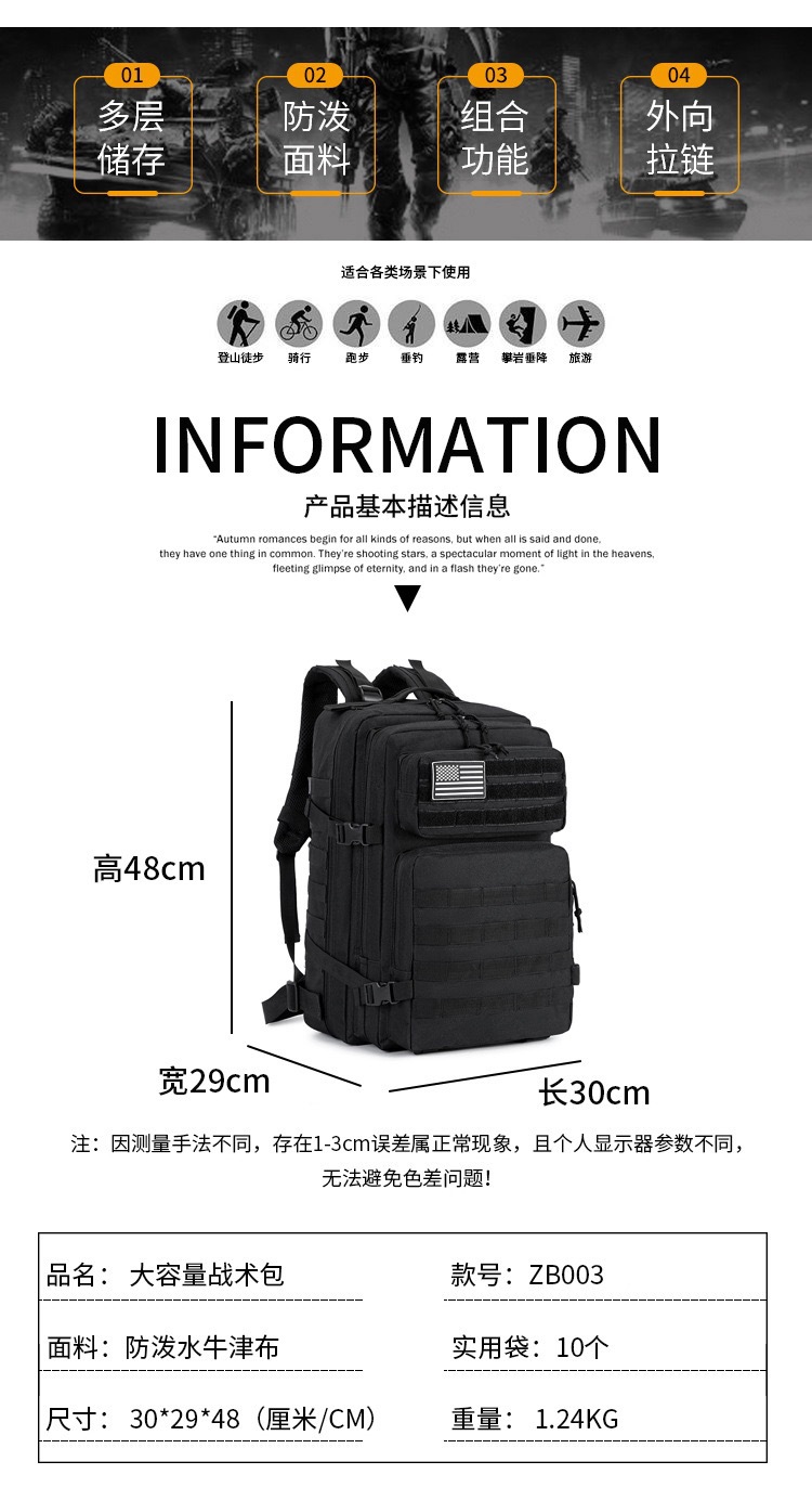 위장 전술 배낭 다기능 방수 및 내마모성 등산 가방 야외 하이킹 캠핑 배낭 대형 3P 배낭스토어 가기