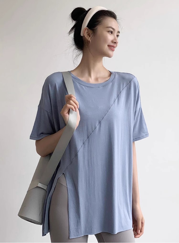 여름 얇은 반팔 스플릿 요가 티셔츠 탑 여성 피트니스 의류 속건 스포츠 블라우스 느슨한 통기성 달리기스토어 가기