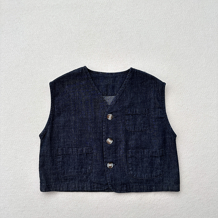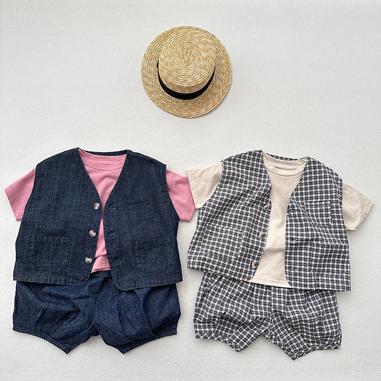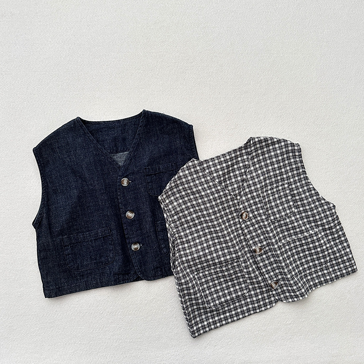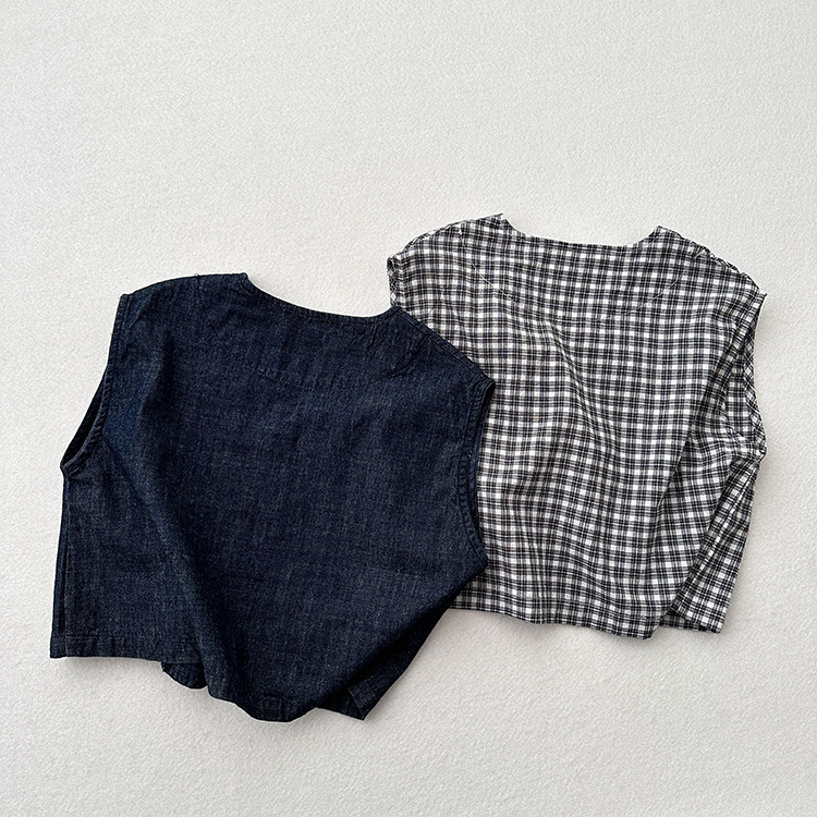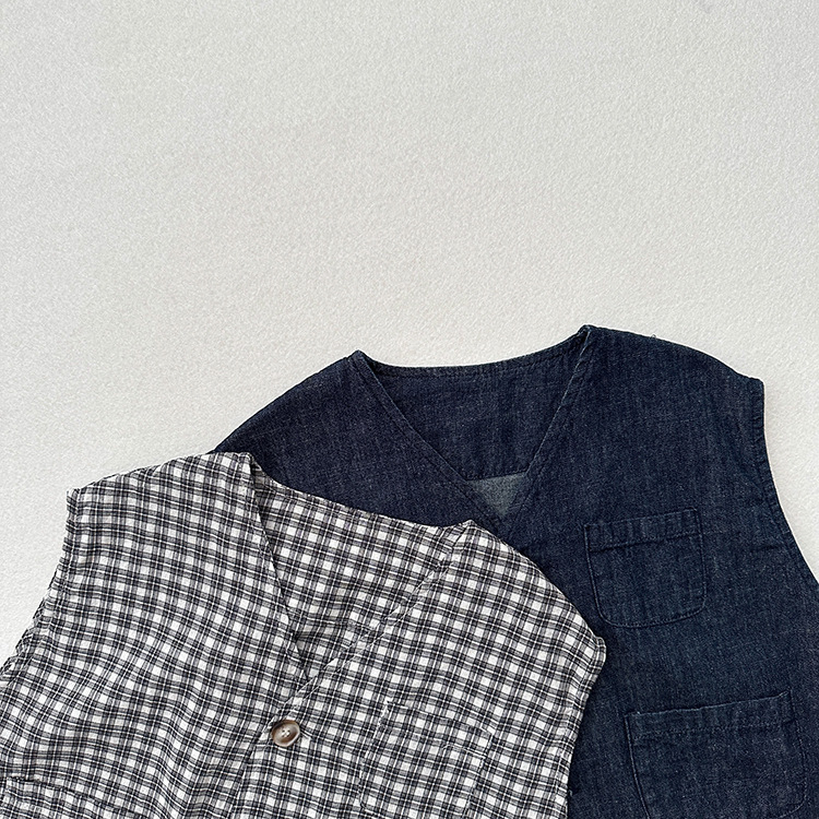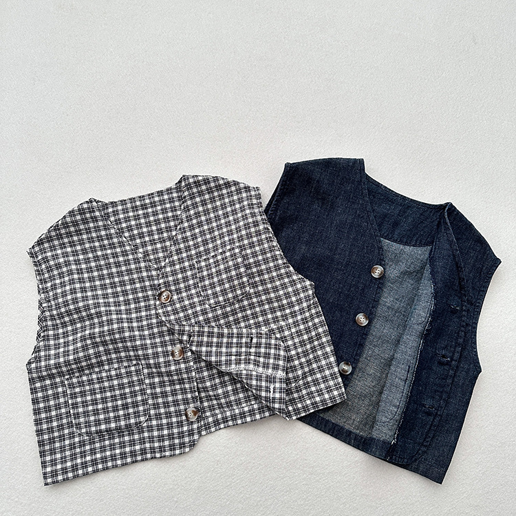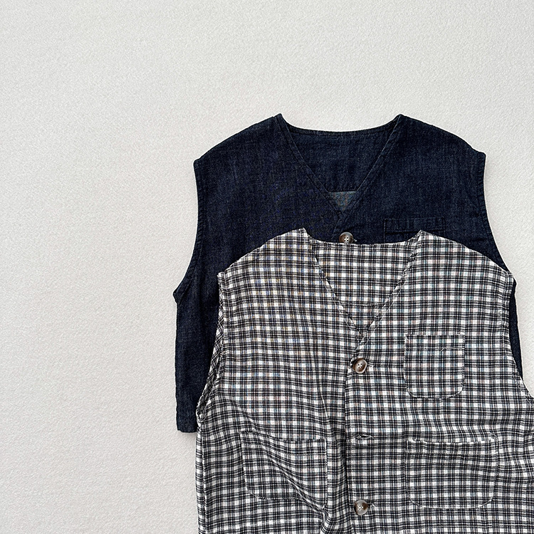 어린이 웨이슬 격자 무늬 데님 조끼 봄과 여름 신상품 소년과 소녀를위한 얇은 일본식 면화와 린넨 유행 조끼