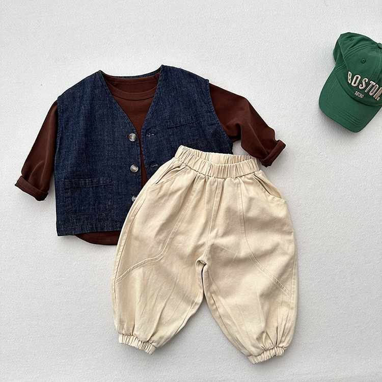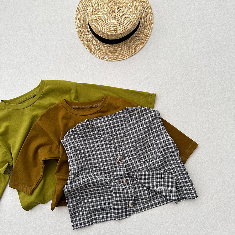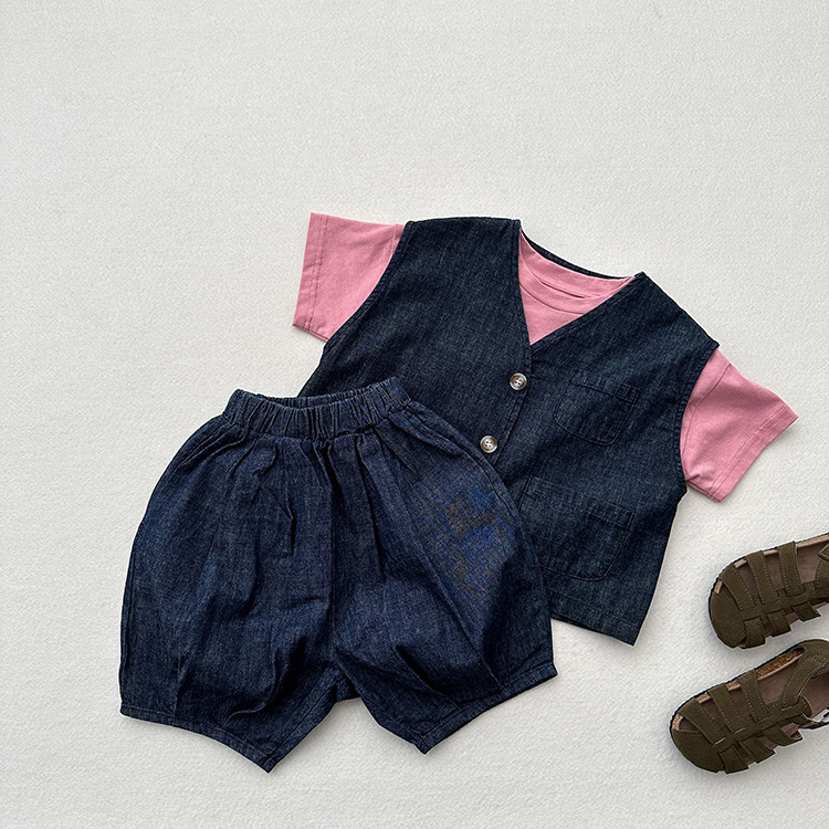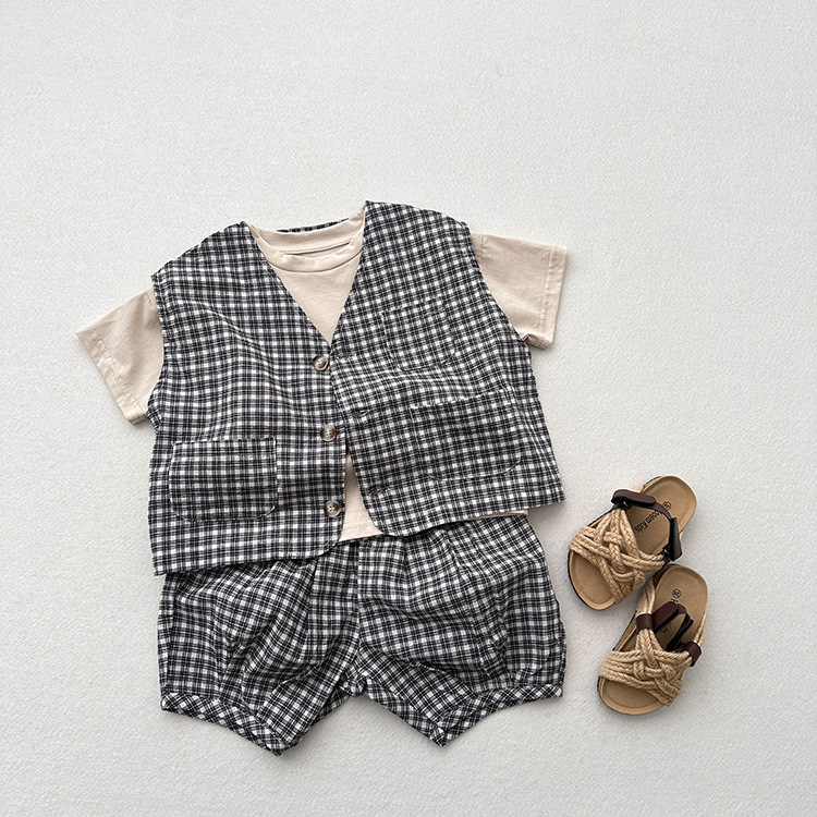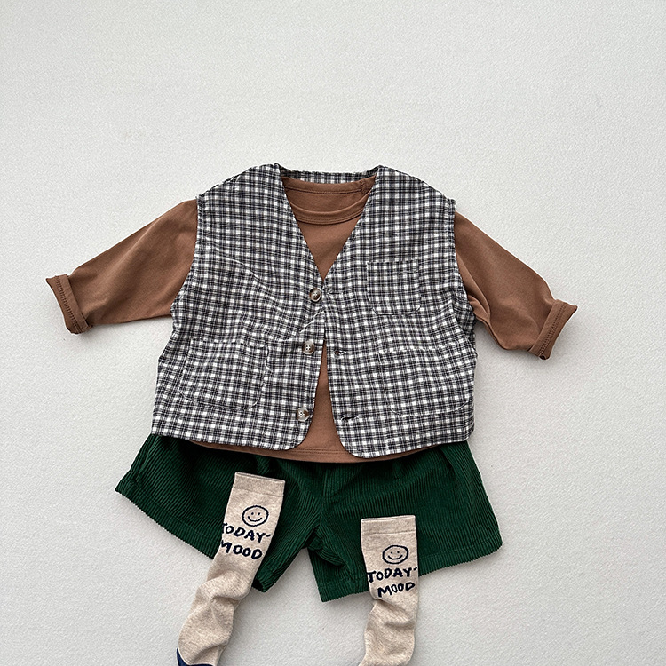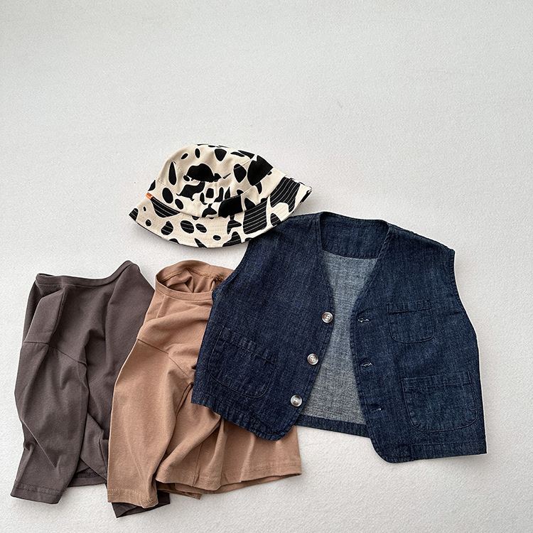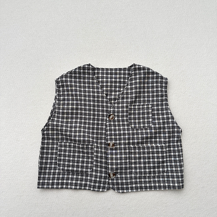 어린이 웨이슬 격자 무늬 데님 조끼 봄과 여름 신상품 소년과 소녀를위한 얇은 일본식 면화와 린넨 유행 조끼
