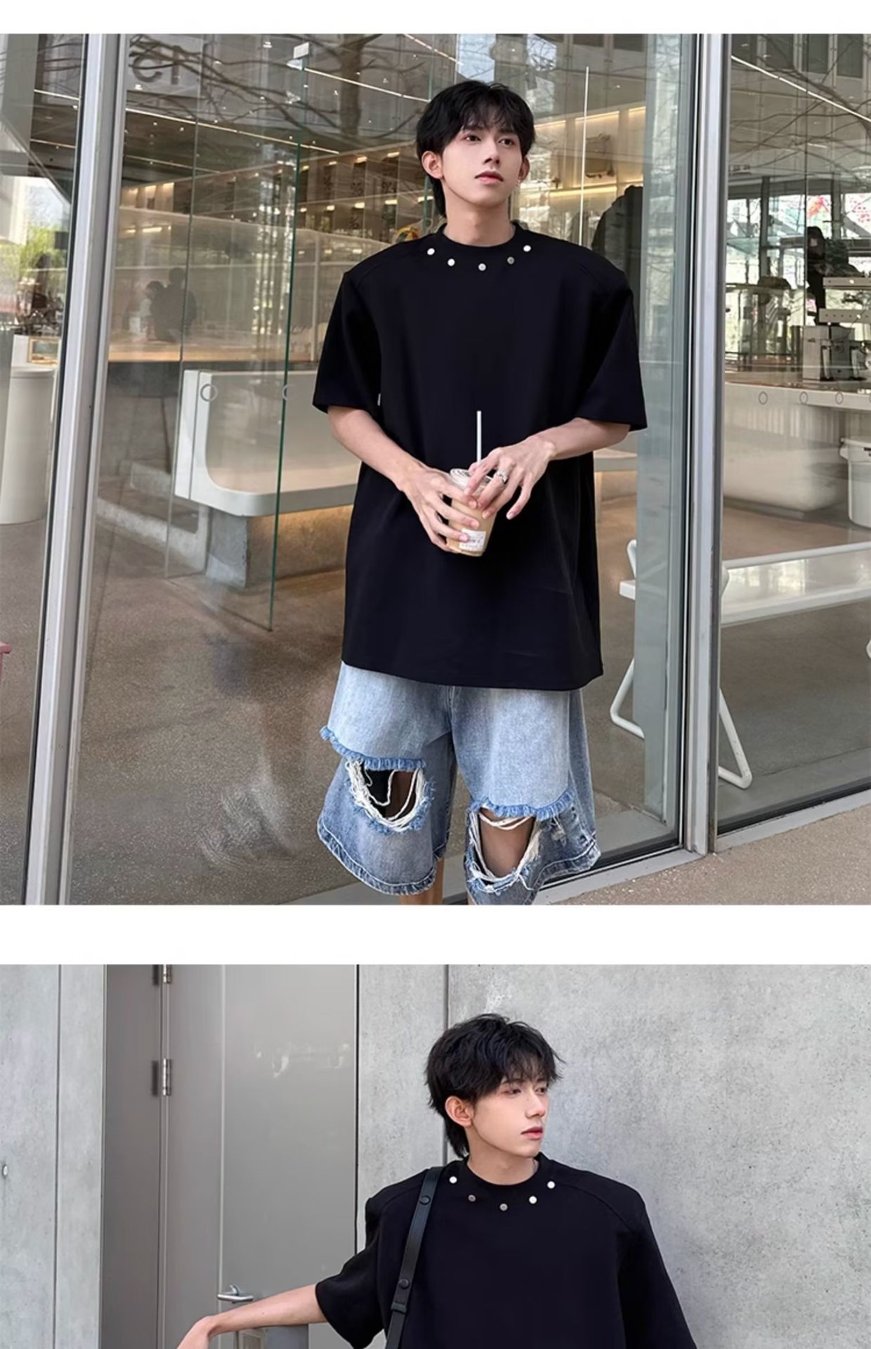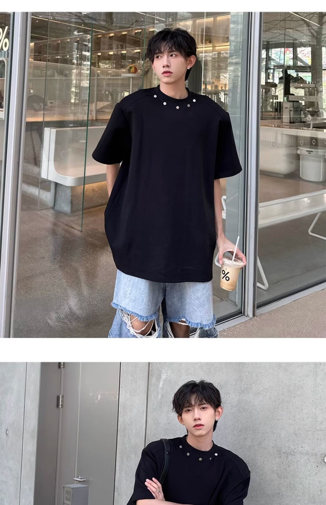 아메리칸 스타일 리벳 패드 숄더 티셔츠 남성용 여름 트렌디 한 브랜드 디자인 센스 틈새 감각 긍정적 인 어깨 반 소매 루즈한 탑