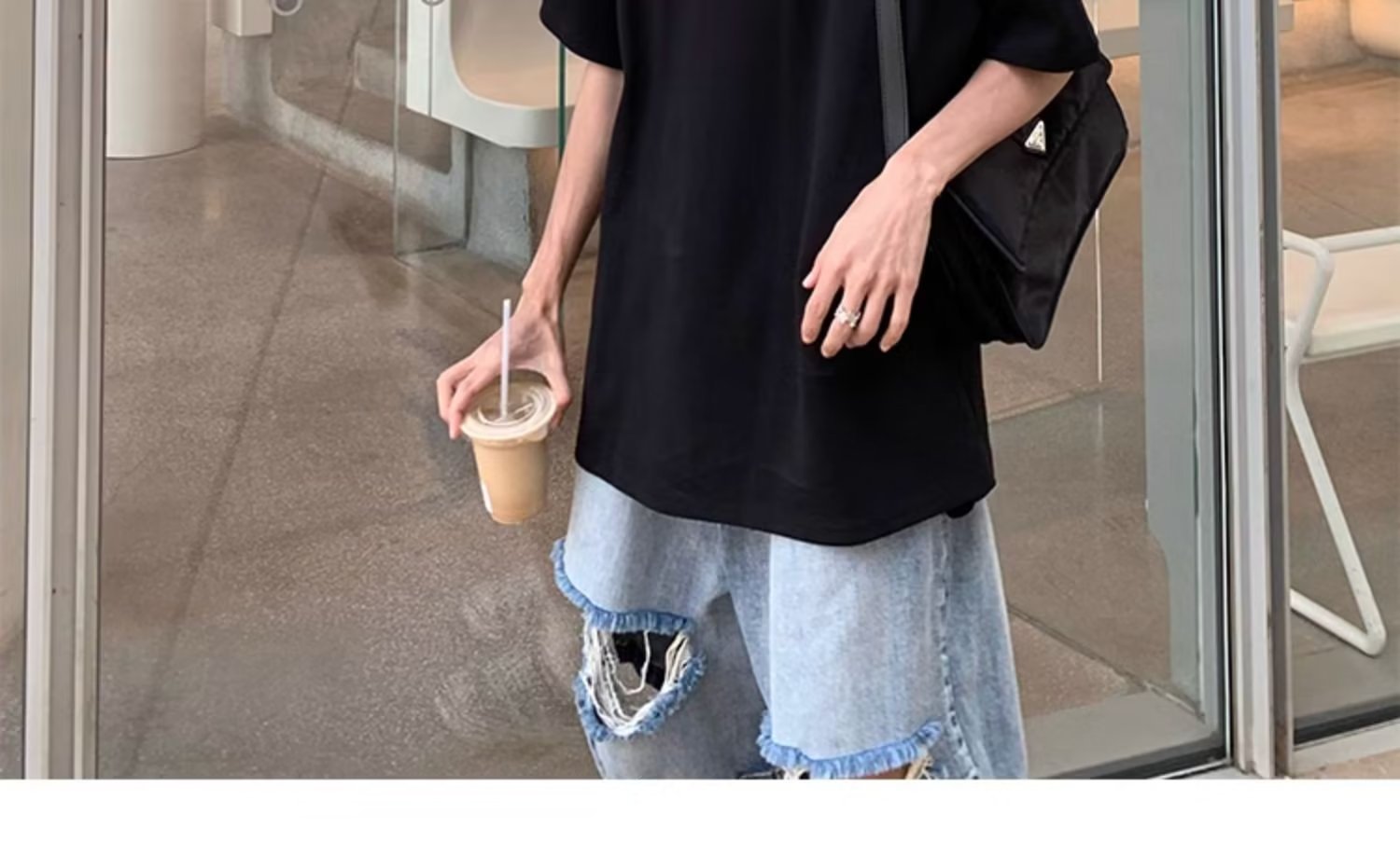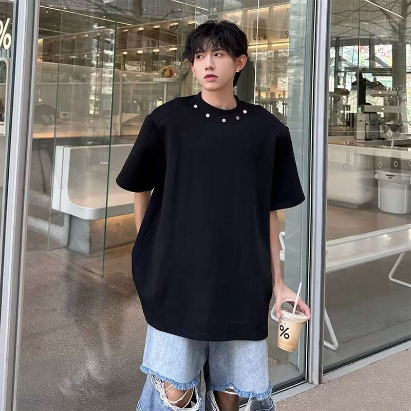 아메리칸 스타일 리벳 패드 숄더 티셔츠 남성용 여름 트렌디 한 브랜드 디자인 센스 틈새 감각 긍정적 인 어깨 반 소매 루즈한 탑스토어 가기