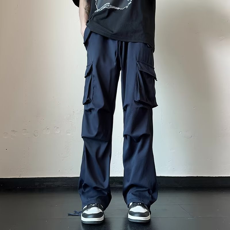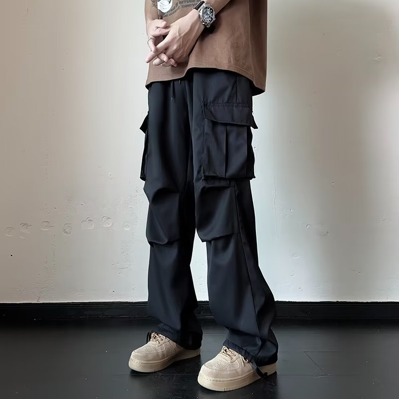 블랙 카고 팬츠 남성용 얇은 트렌디 브랜드 와이드 레그 캐주얼 팬츠 여름 남성용 스트레이트 레그 루즈한 팬츠