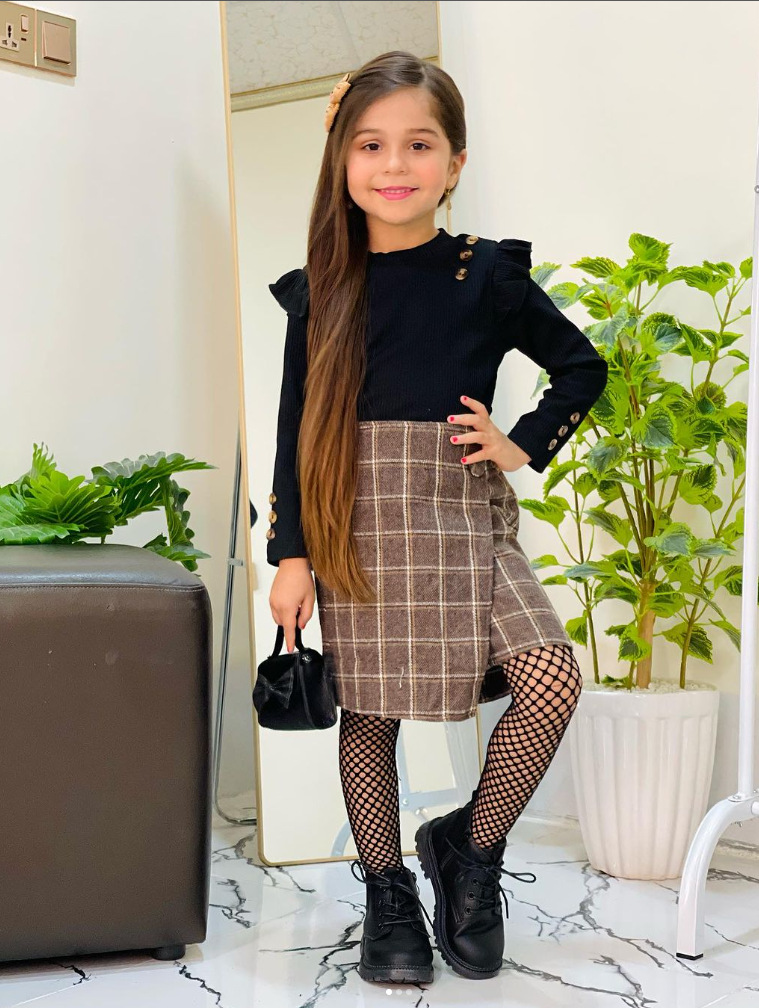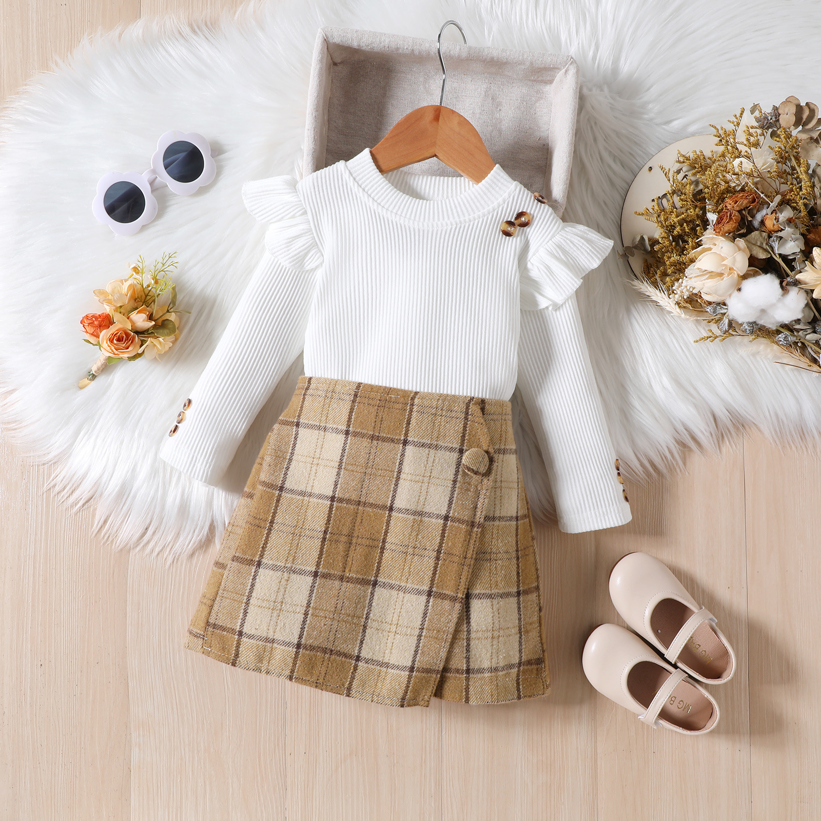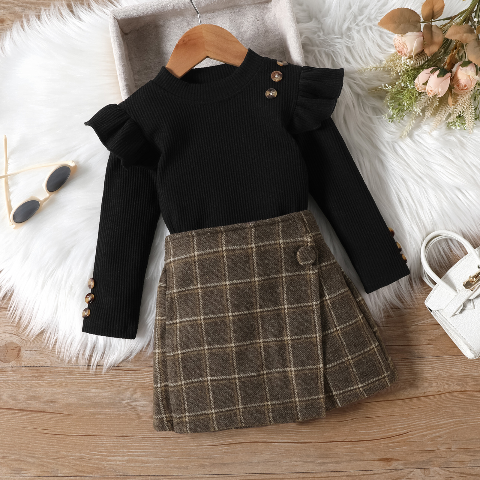 2023 유럽과 미국 봄과 가을 소녀 구덩이 비행 소매 긴 소매 탑 불규칙한 격자 무늬 짧은 스커트 투피스 세트
