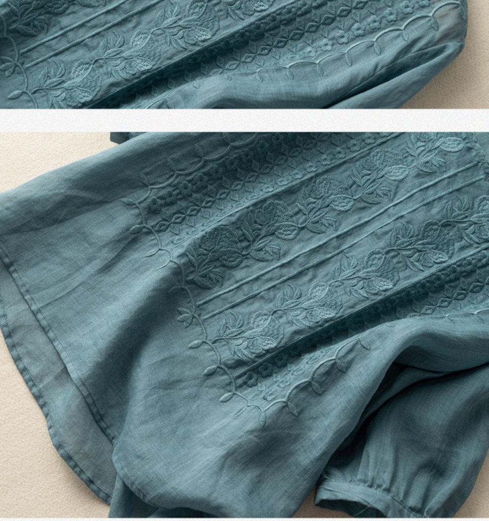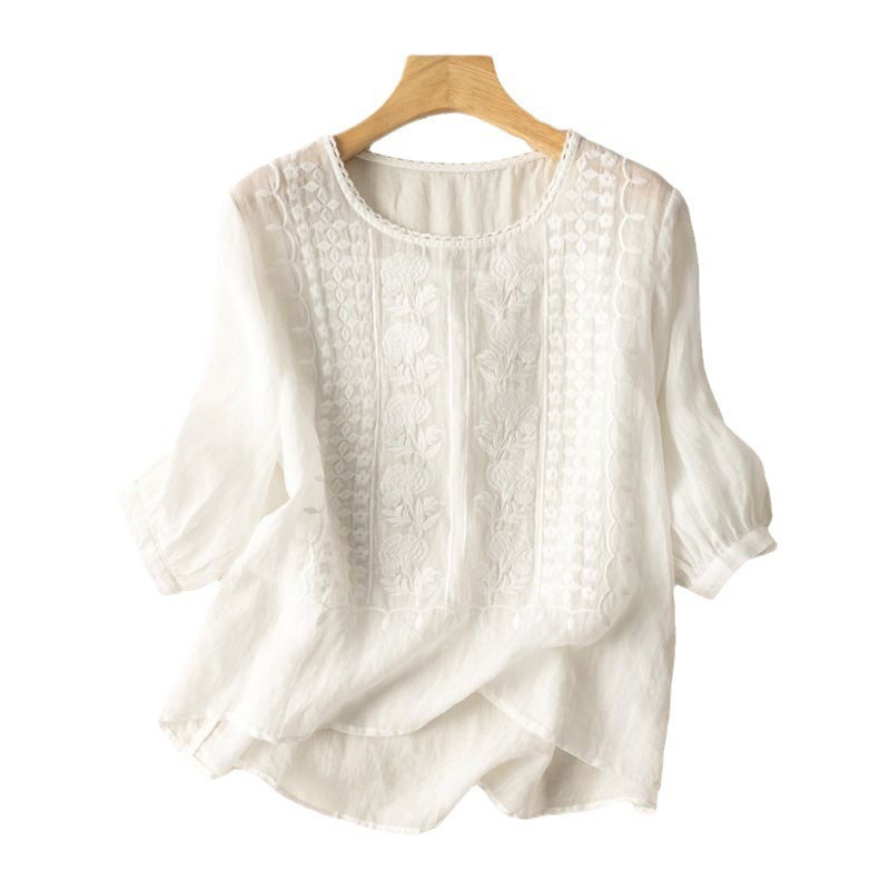 중간 소매 면과 린넨 탑 여성용 자수 느슨한 예술적 빈티지 면과 린넨 티셔츠 여름 얇은 선 차 옷 느슨한 여성스토어 가기