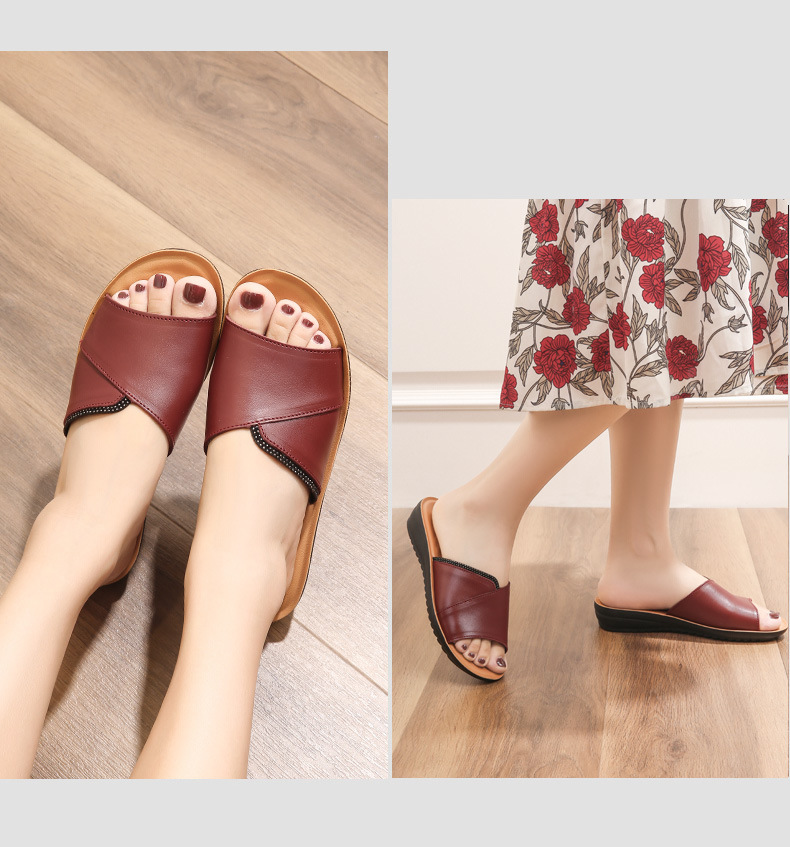 탑 레이어 소가죽 마더 슬리퍼 여성용 여름 아우터 부드러운 바닥 미끄럼 방지 천연 가죽 플랫 바닥 노인용 중년 샌들