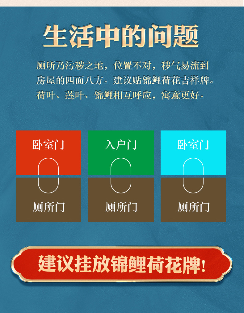 • 화장실은 남쪽에 위치하며(9마리의 물고기, 연꽃, 복숭아나무, 박 모형) 끈끈이 고리가 제공됩니다.