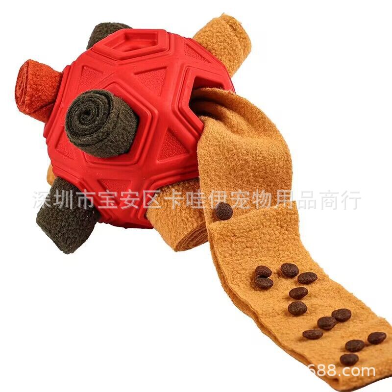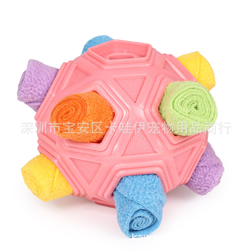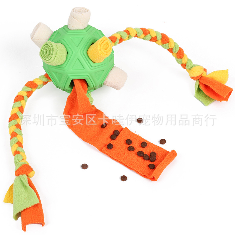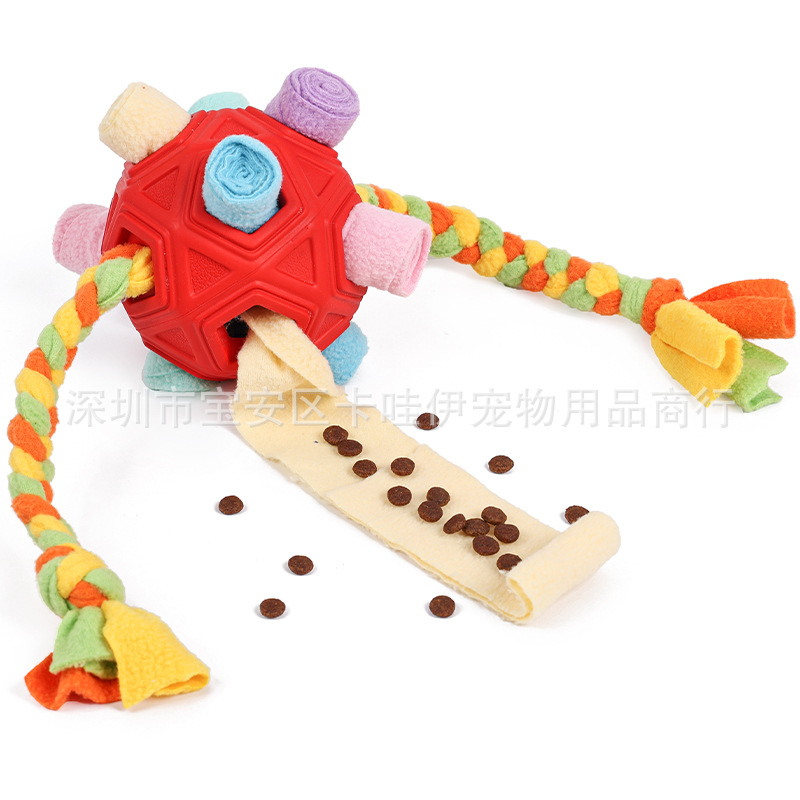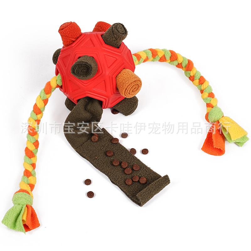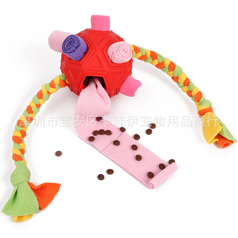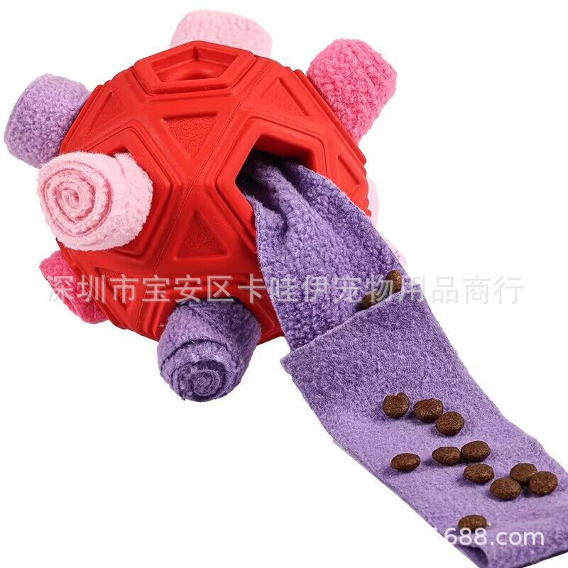 把零食放在最小孔里,狗狗边滚动球零食会慢慢掉出来