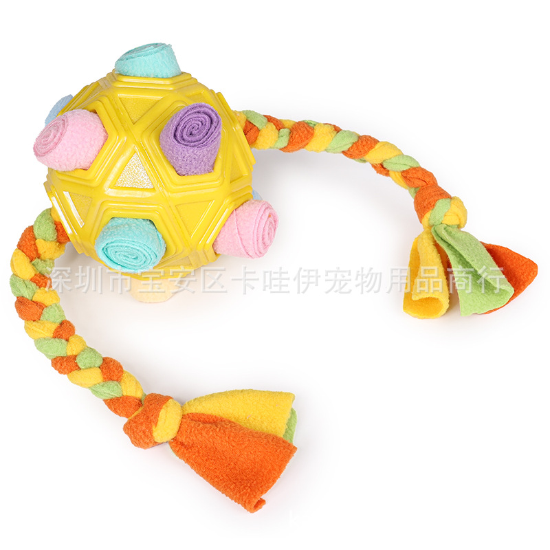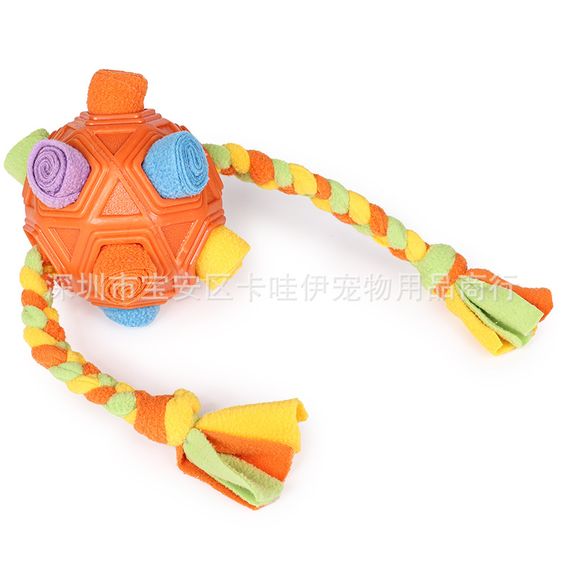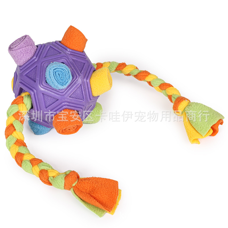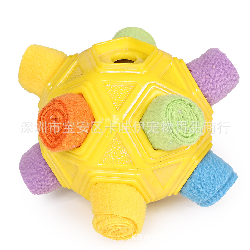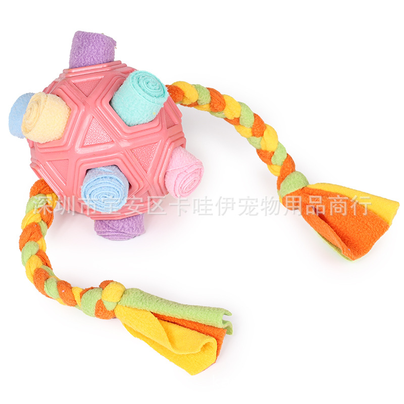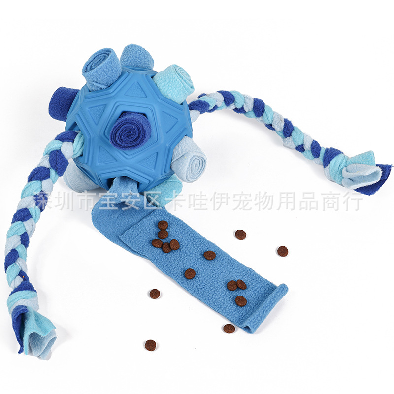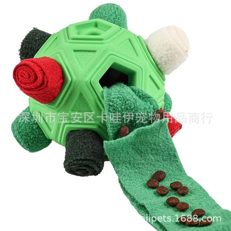 把零食放在最小孔里,狗狗边滚动球零食会慢慢掉出来