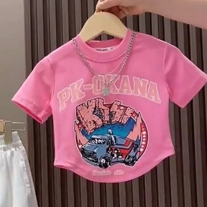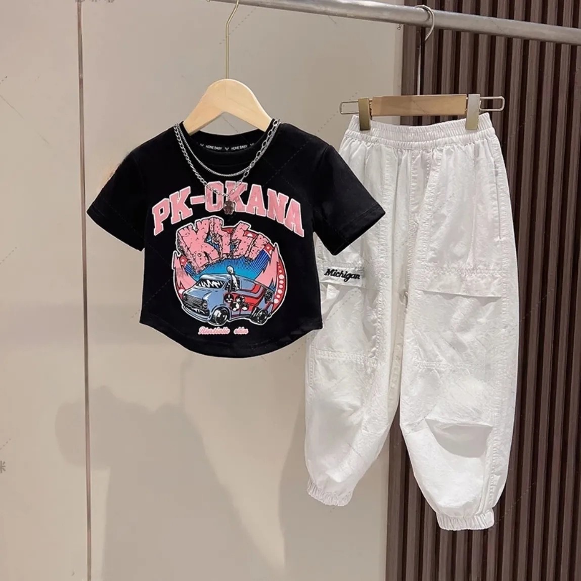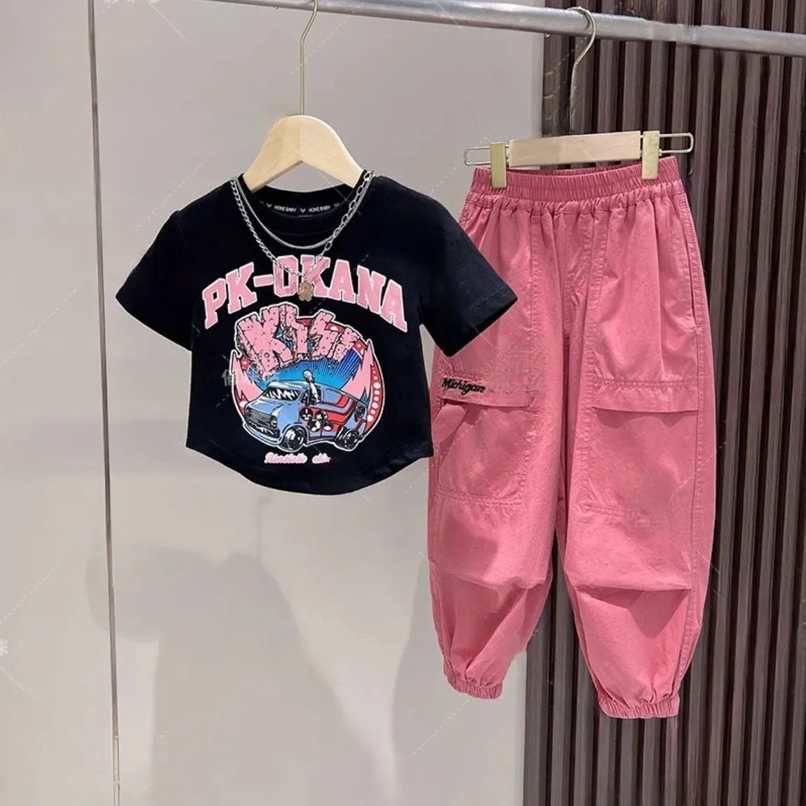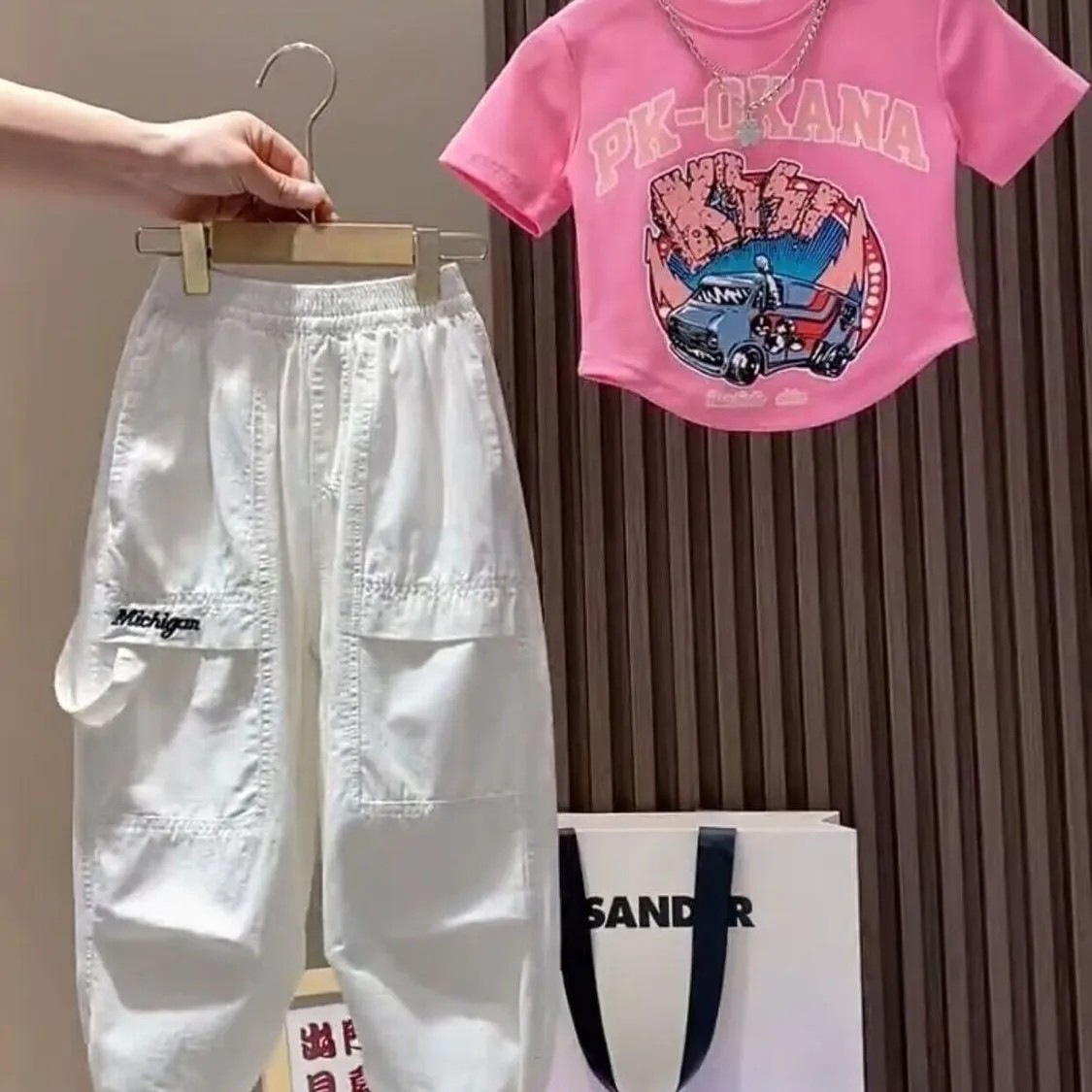 2023 세트 여아 반팔 티셔츠 바지 인터넷 인기 여름 유행 어린이 바지스토어 가기