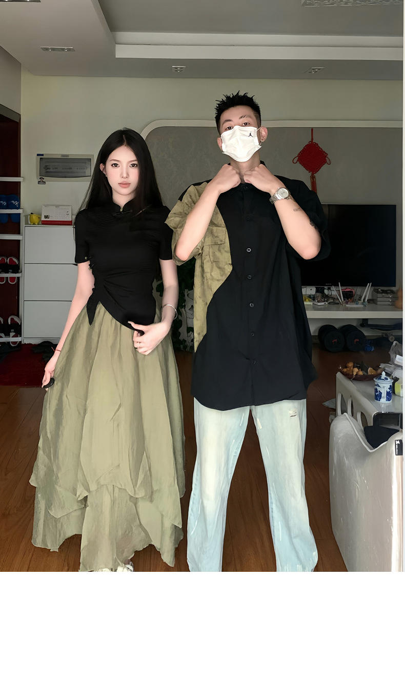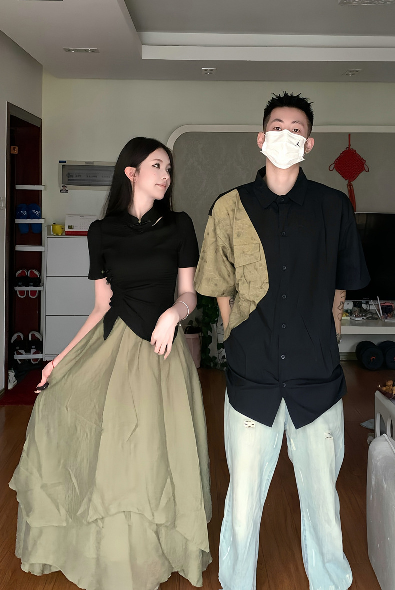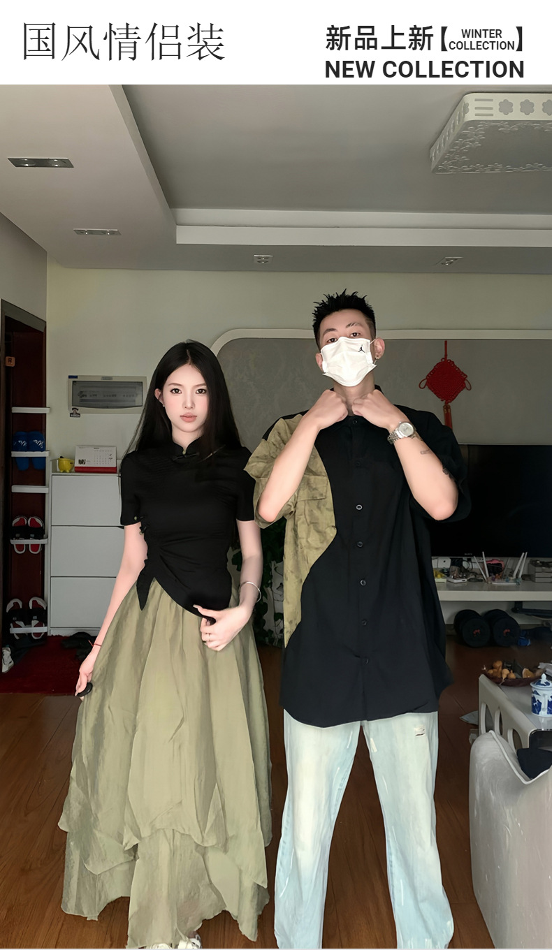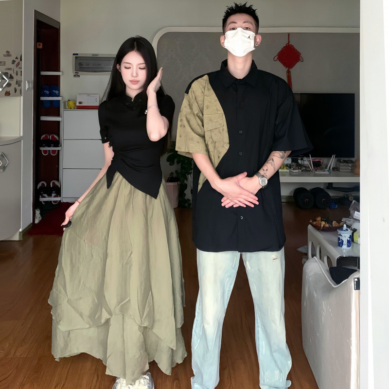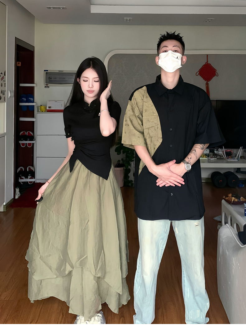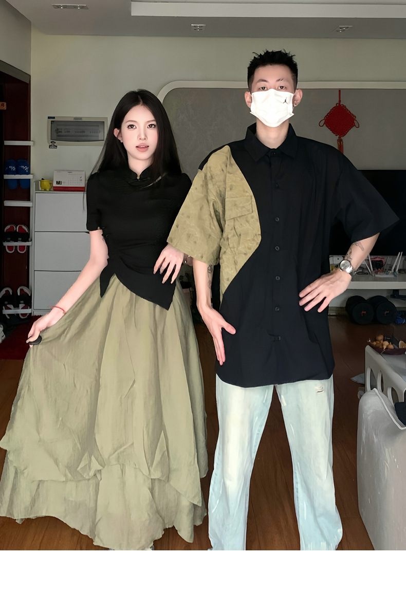 QLZ2023 새로운 중국 스타일 국가 스타일 커플 원피스 버클 꽉 허리 짧은 소매 셔츠 불규칙한 스커트 세트