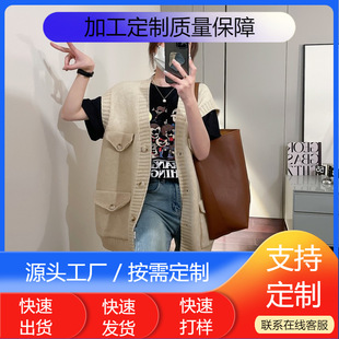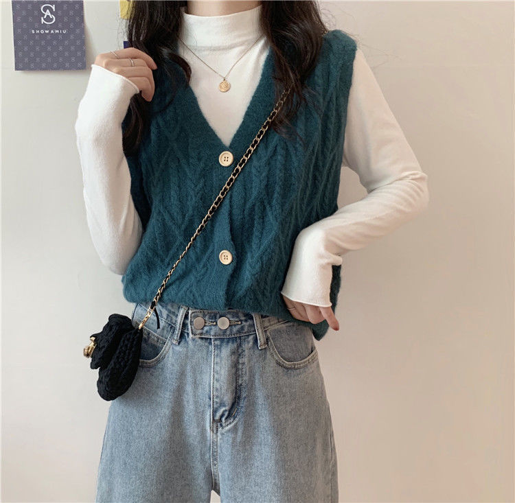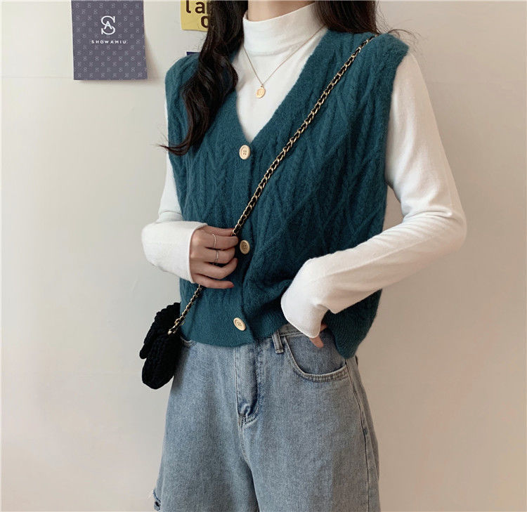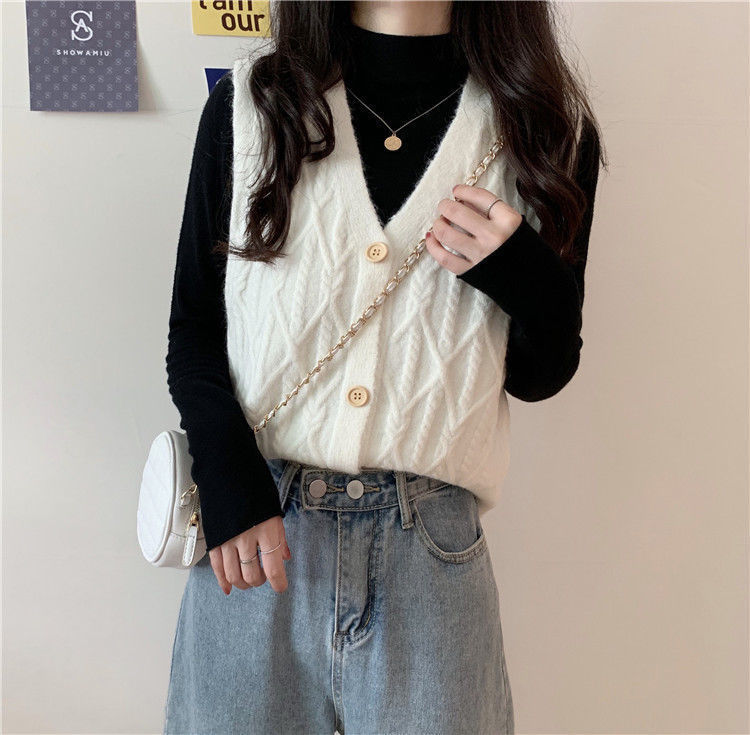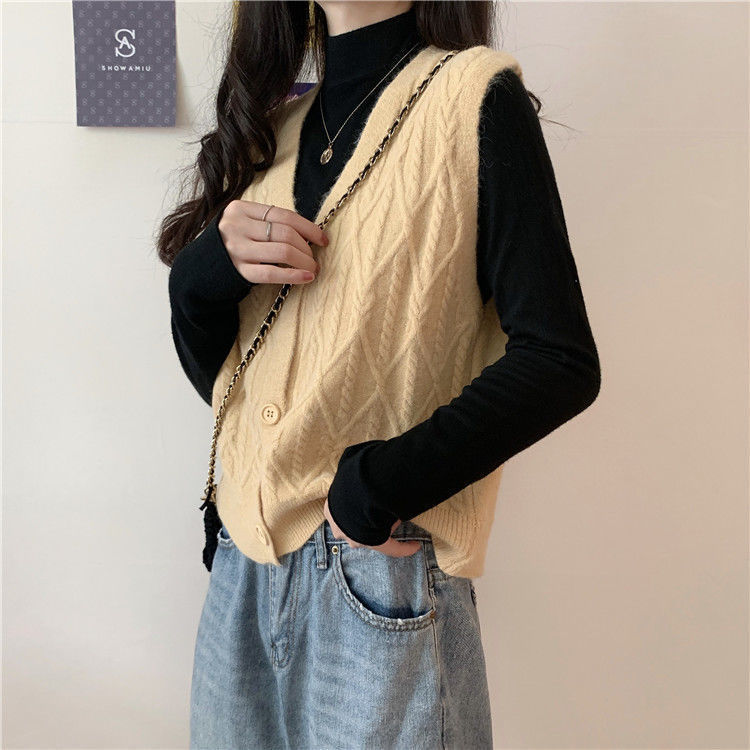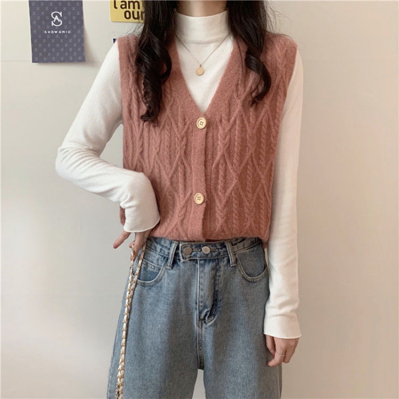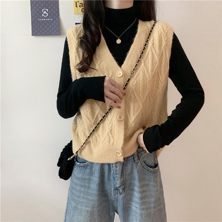 V-넥 싱글 브레스트 니트 가디건 조끼 여성용 봄과 가을 새로운 한국 스타일 여성용 단색 스웨터 만능 조끼 조끼스토어 가기