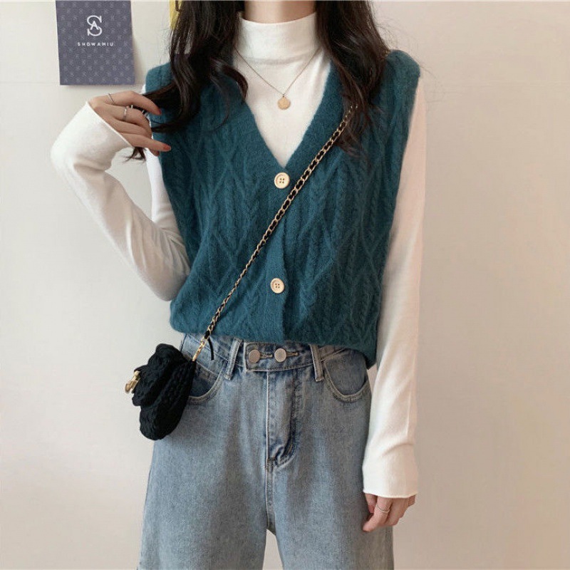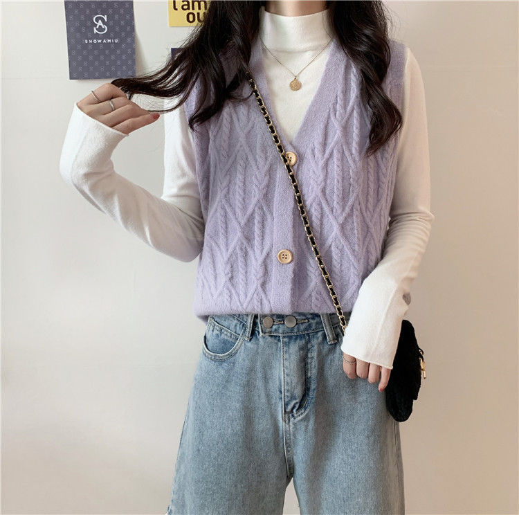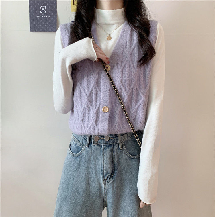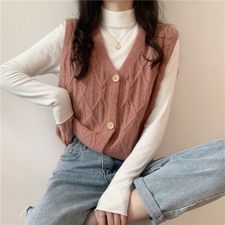 V-넥 싱글 브레스트 니트 가디건 조끼 여성용 봄과 가을 새로운 한국 스타일 여성용 단색 스웨터 만능 조끼 조끼