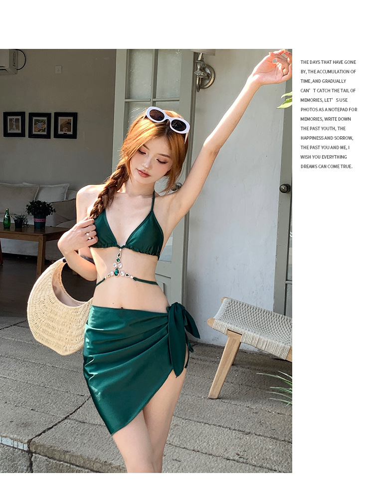 유럽과 미국의 섹시한 녹색 새틴 다이아몬드 3 점 비키니 패션 고삐 백리스 화이트 비치 휴가 수영복스토어 가기