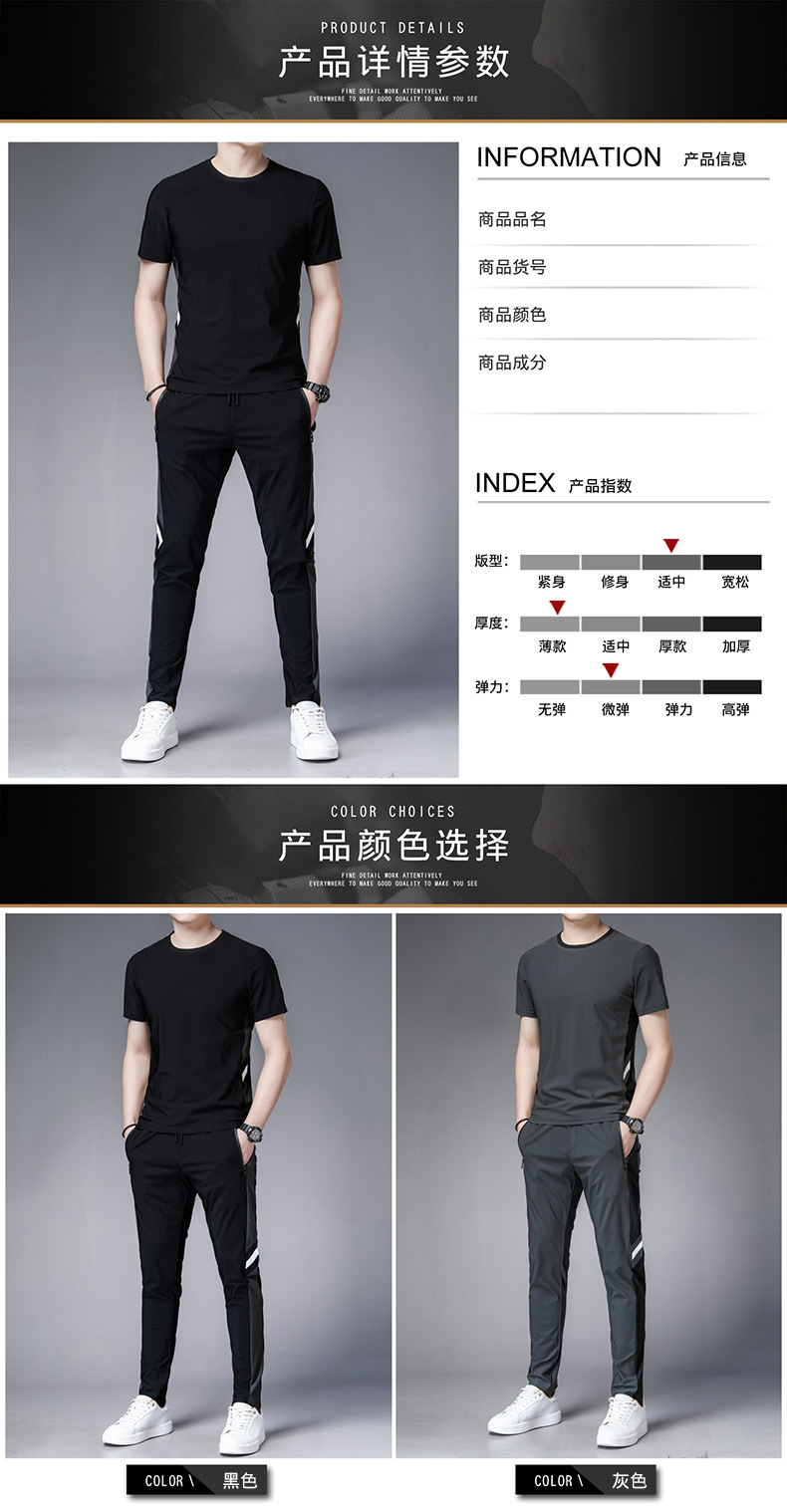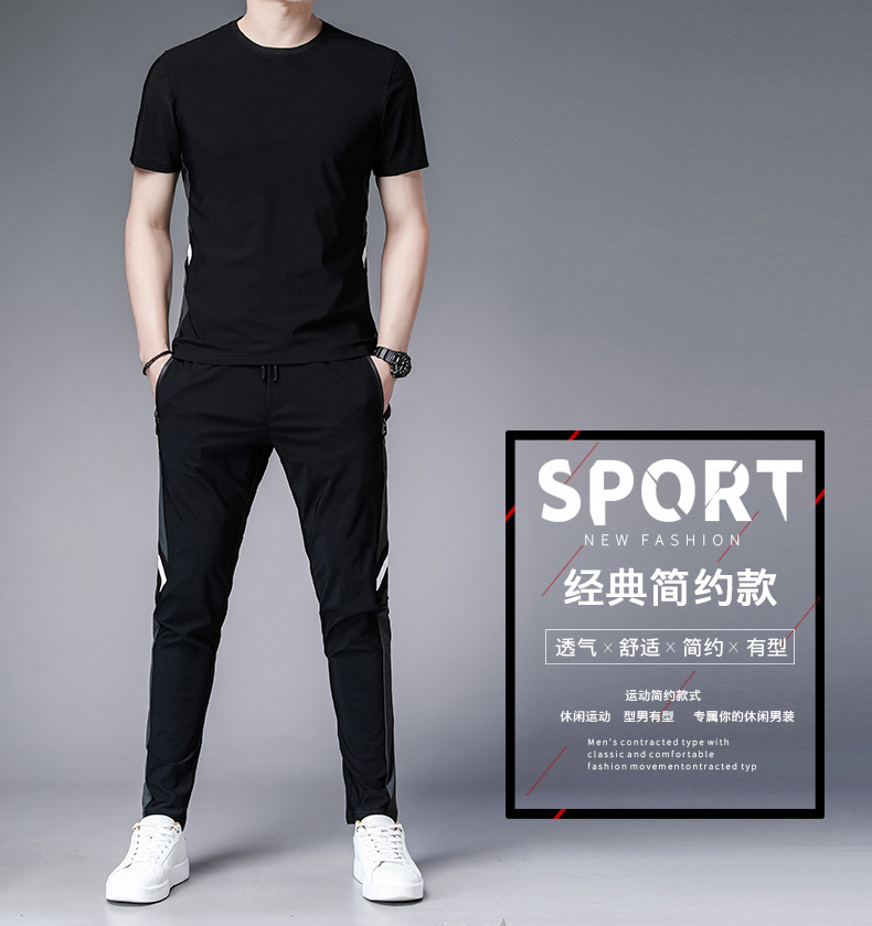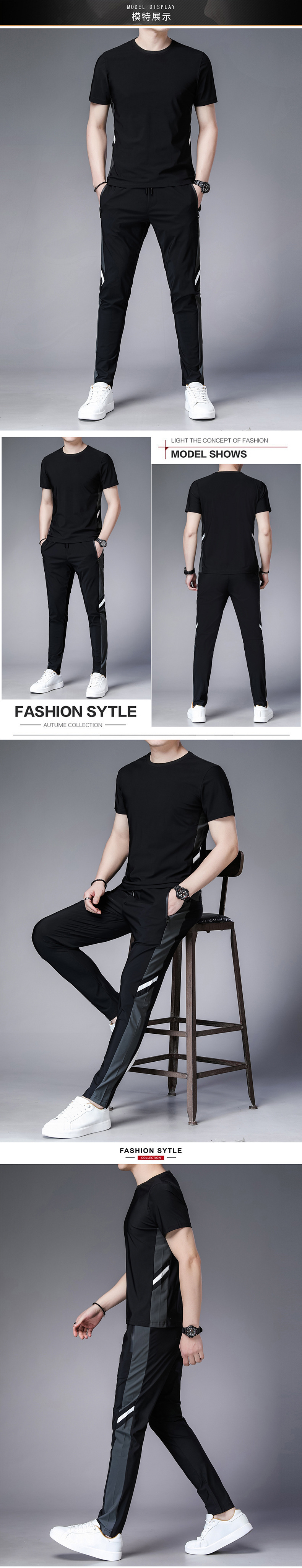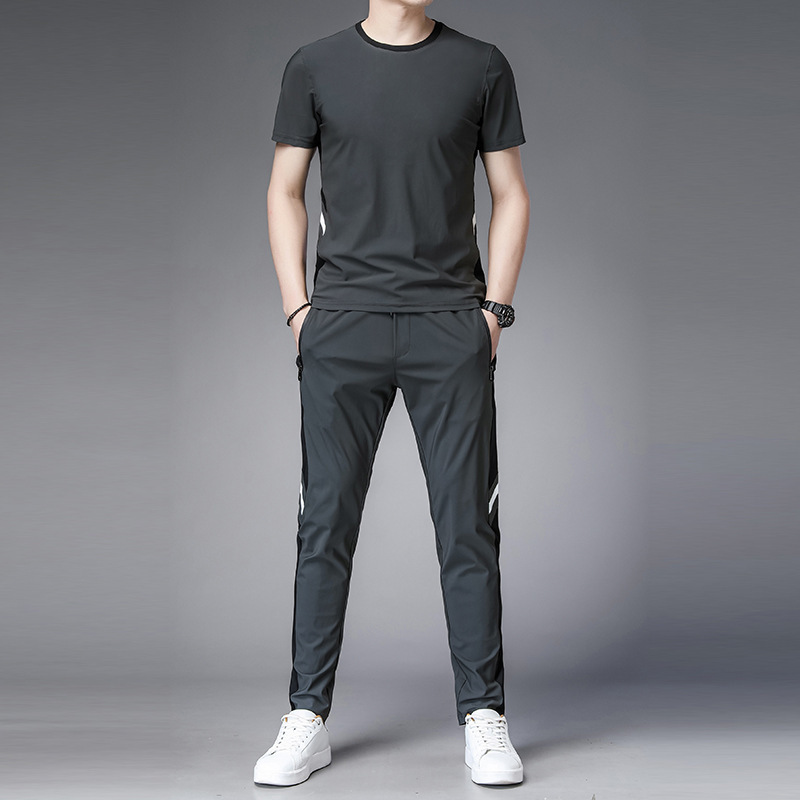 2023 여름 새로운 남성 캐주얼 스포츠 세트 라운드 넥 반팔 티셔츠 남성용 유행 잘 생긴 얇은 투피스 세트