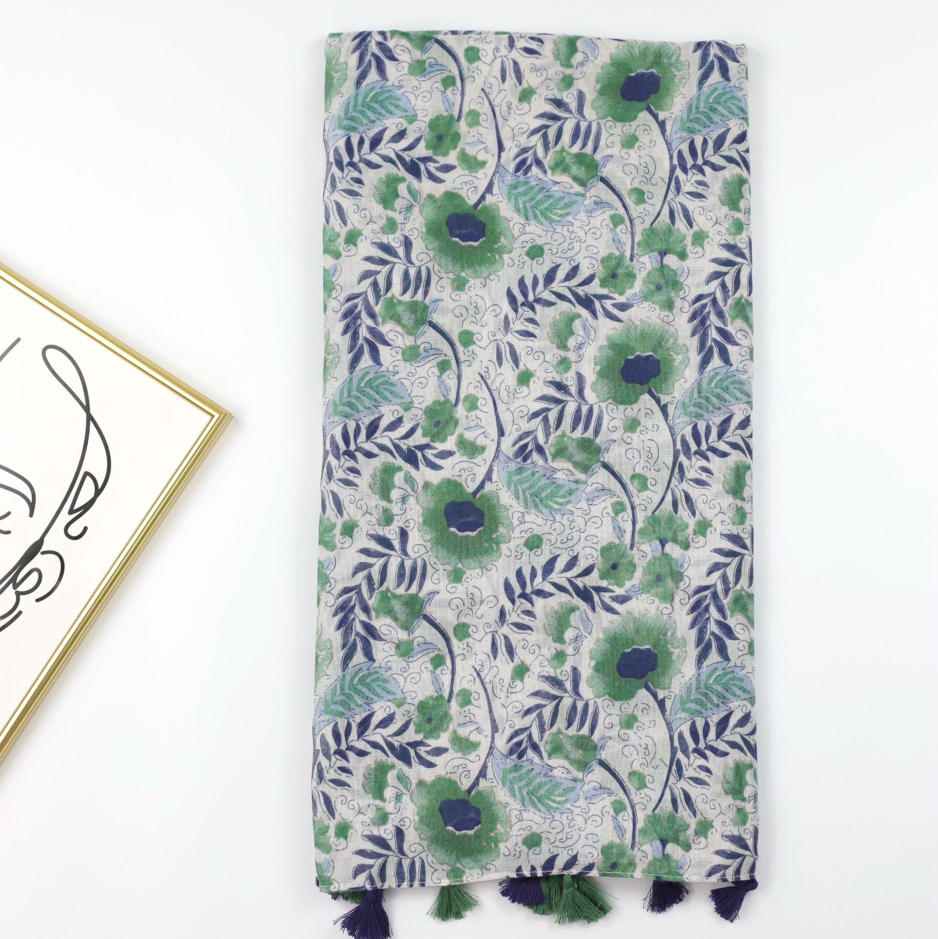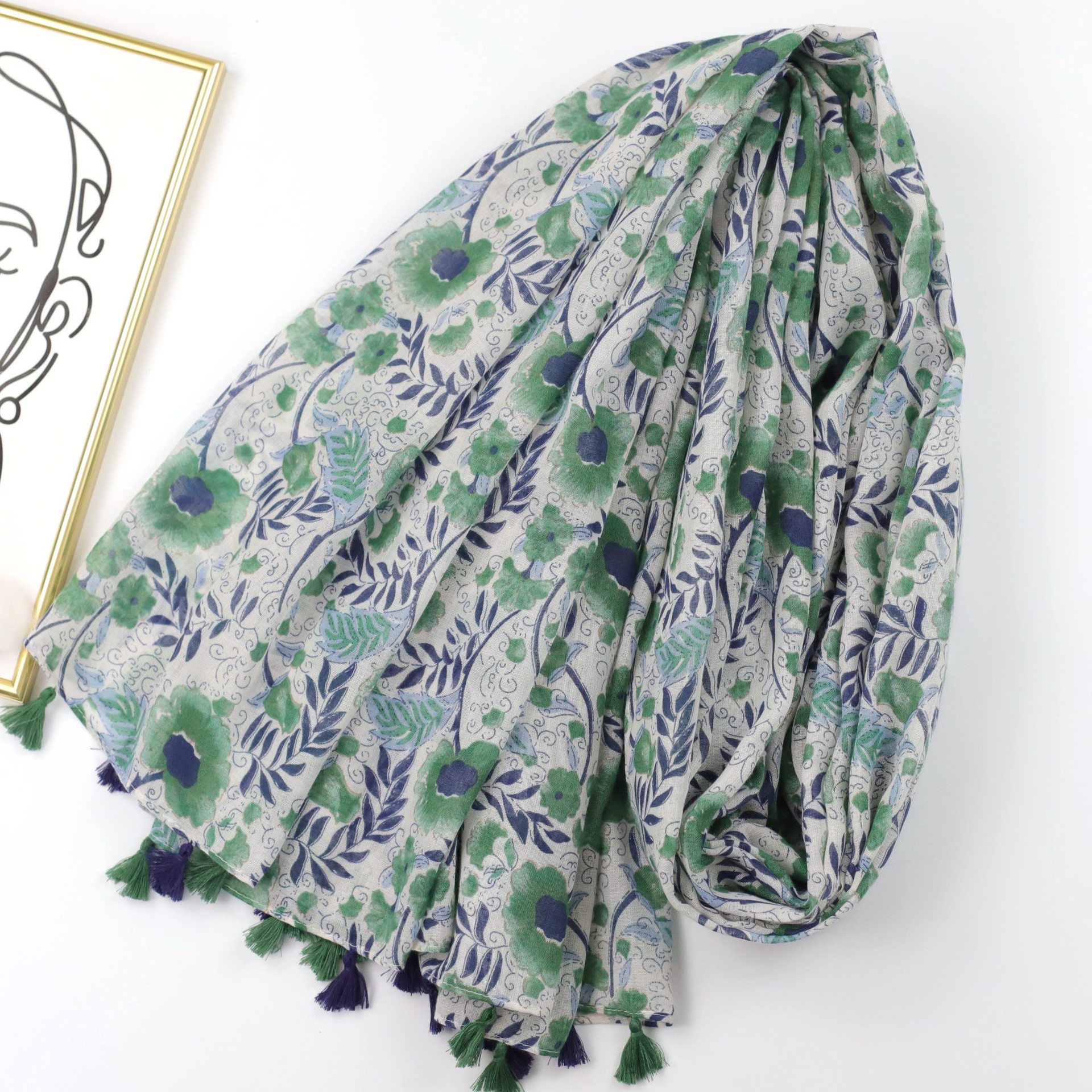 공장 판매 해외 무역 국경 간 작은 신선한 녹색 꽃과 잎 암호화 발리 원사 긴 스카프 여행 자외선 차단제 비치 스카프 실크 스카프