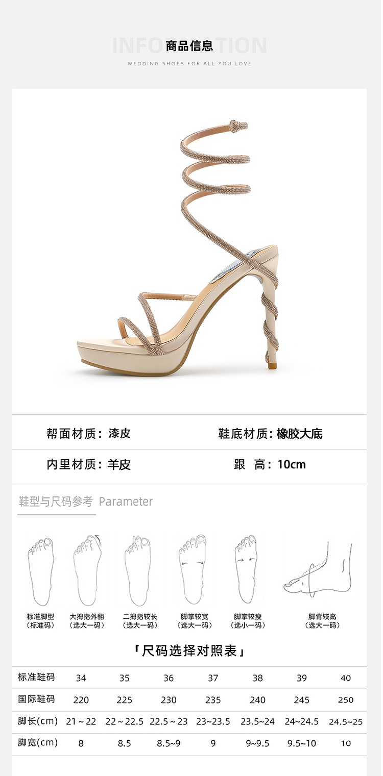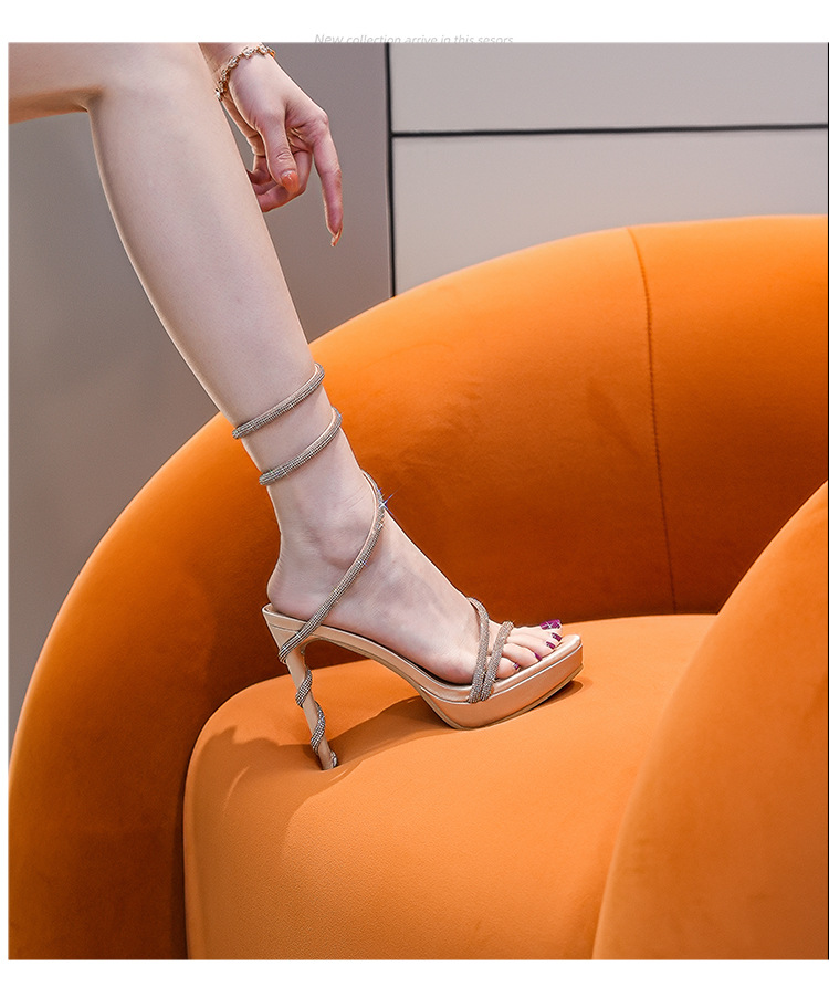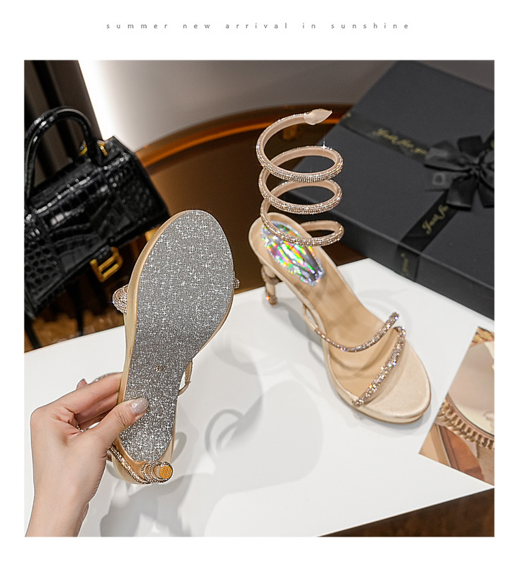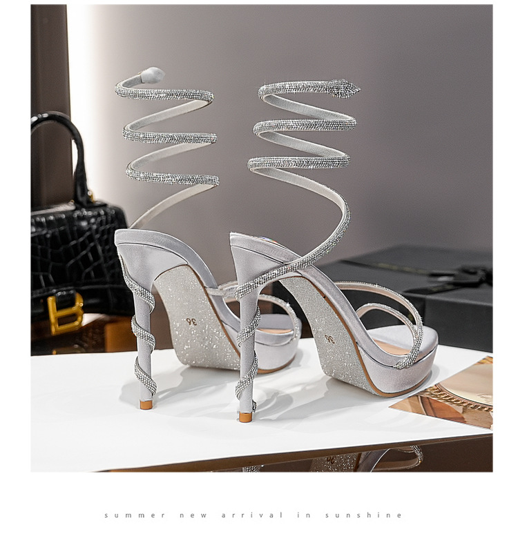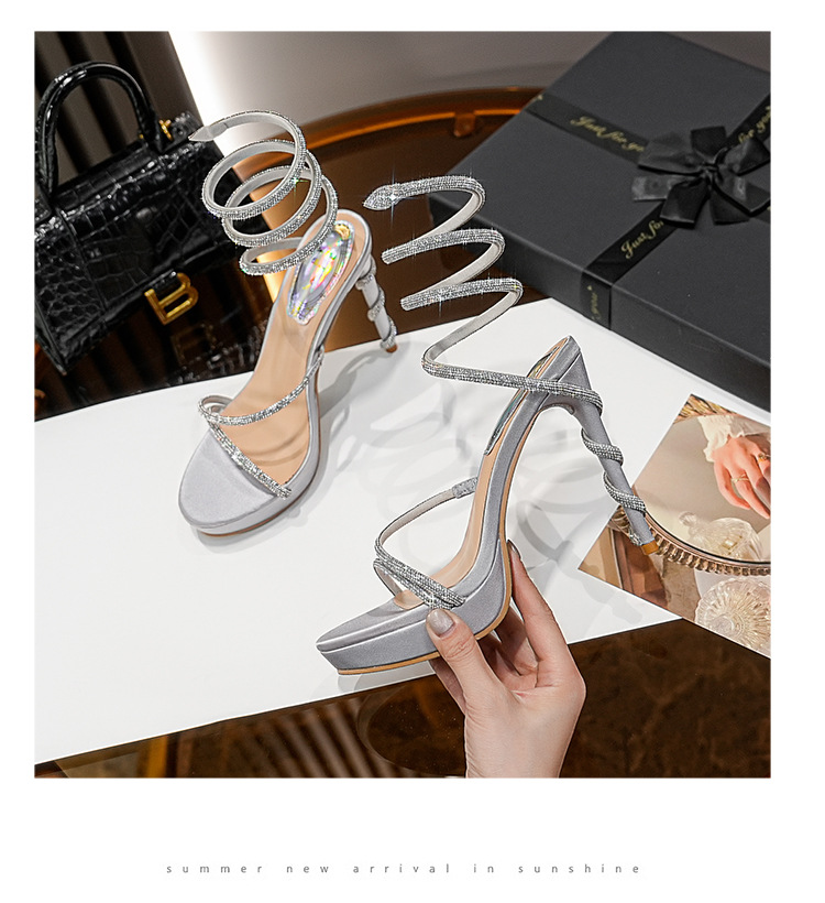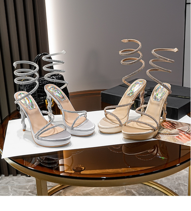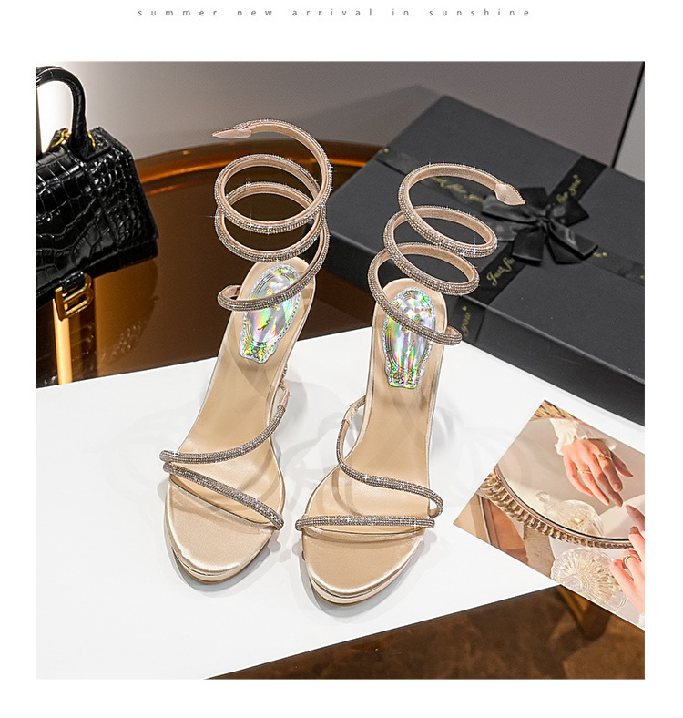 Wu Xuanyi 동일 스타일 RC Rhinestone 샌들 여성용 뱀 모양의 랩 섹시 오픈 발가락 힐토 플랫폼 하이힐 신발스토어 가기