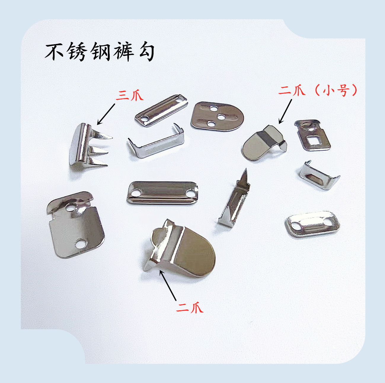 主营产品:螺丝大白扣,金属四合扣,大白扣,各类型气眼,五爪扣,铆钉,9字扣,8字扣,裤勾,磁力扣,吊钟,铜管系列等等,也欢迎来样定制。