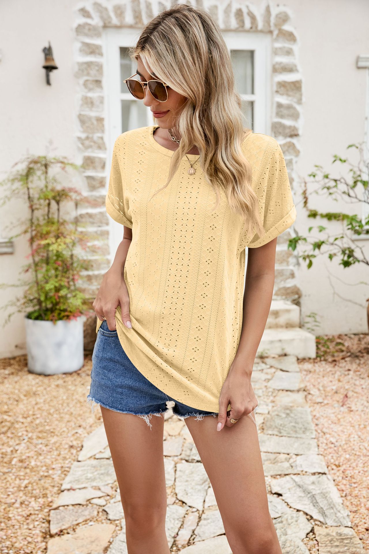 2024 년 여름 새로운 국경 유럽 및 미국 여성 아마존 홀 할로우 크루 넥 반팔 아이 캐주얼 티셔츠스토어 가기