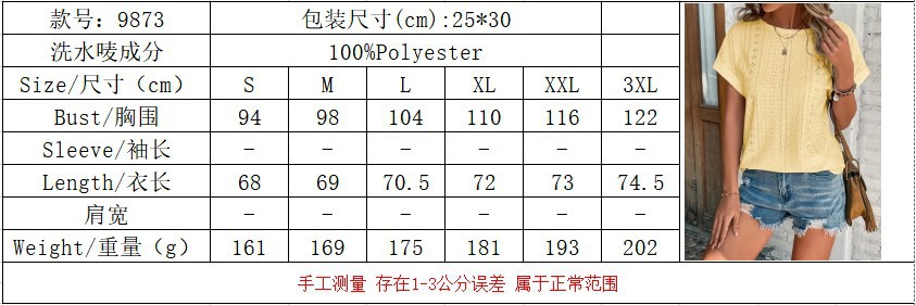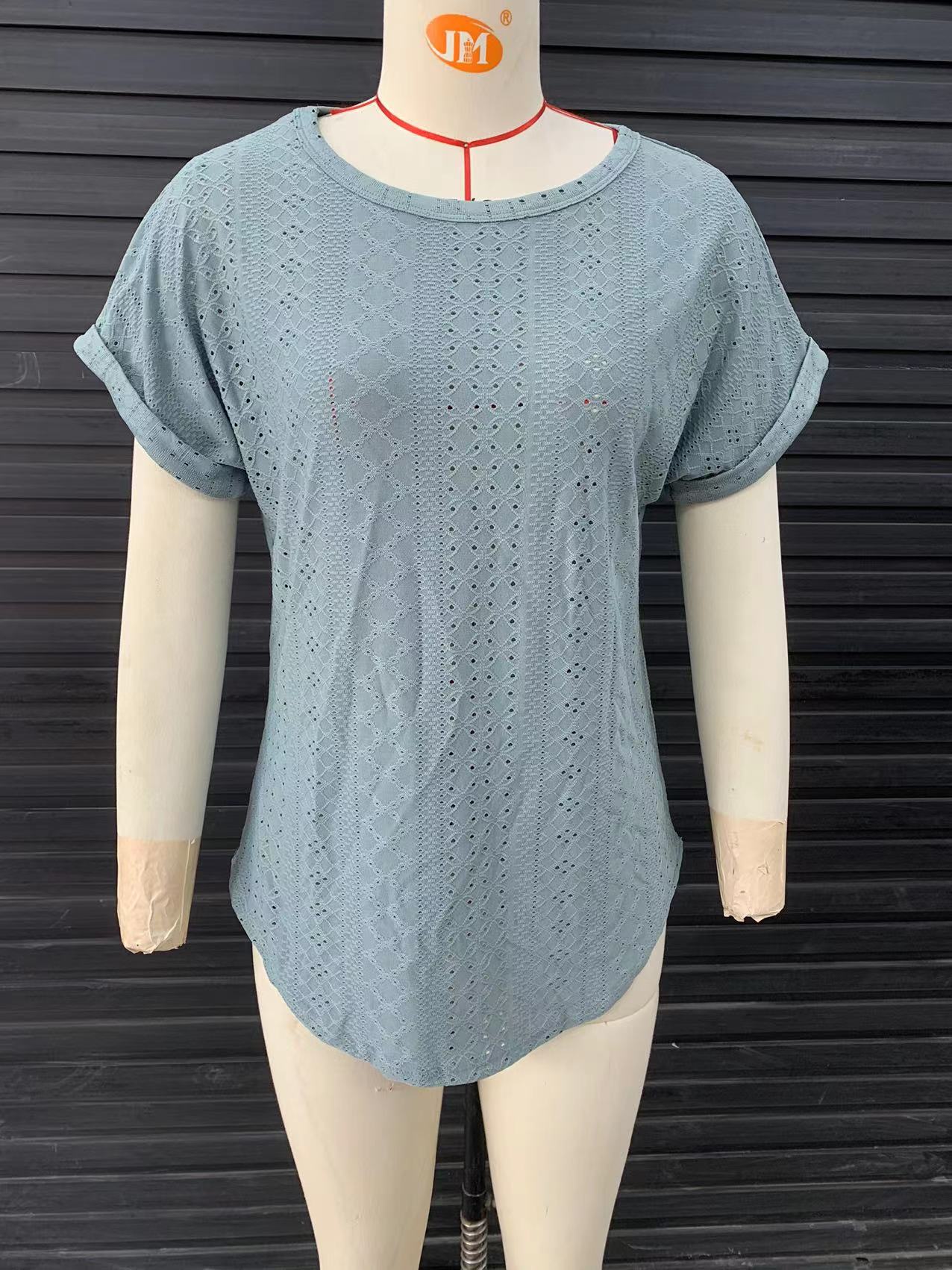 2024 년 여름 새로운 국경 유럽 및 미국 여성 아마존 홀 할로우 크루 넥 반팔 아이 캐주얼 티셔츠