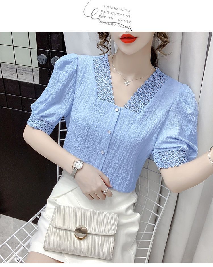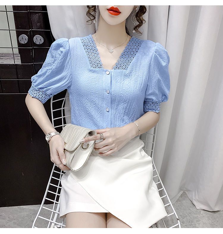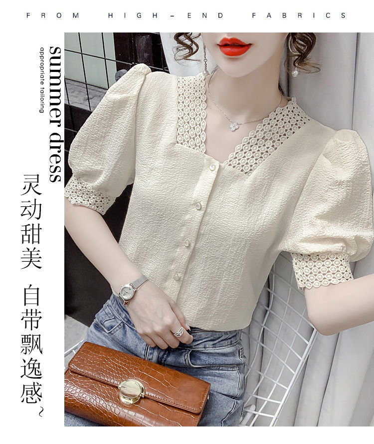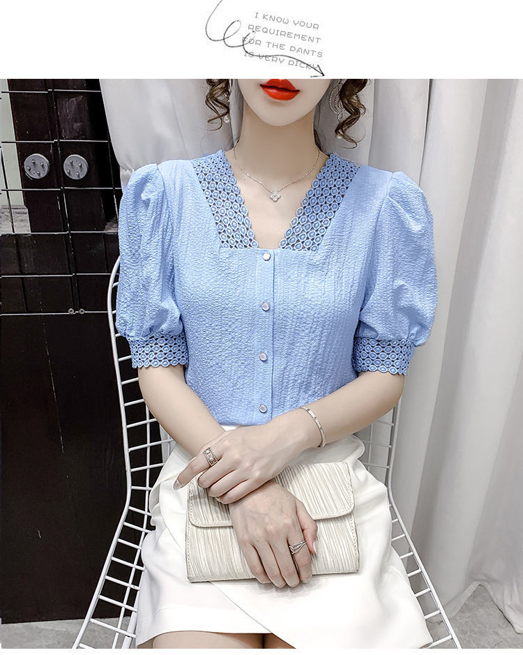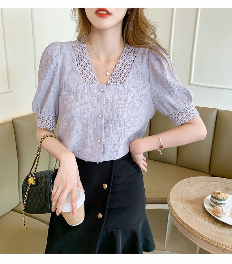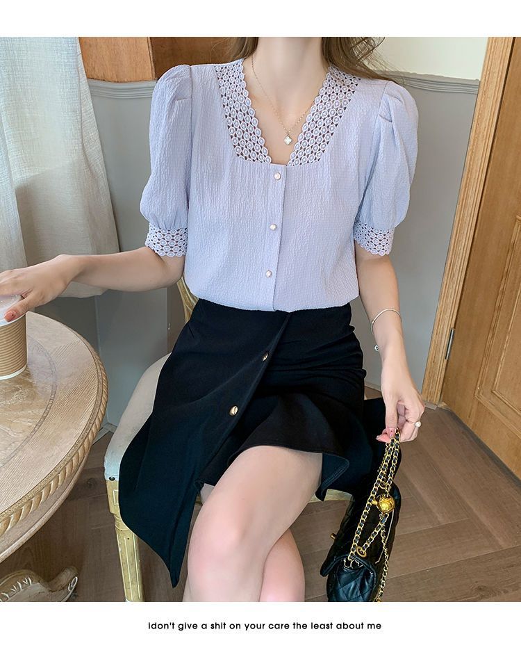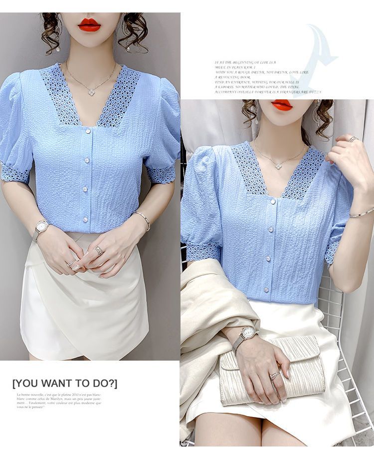 2023 중공 레이스 V-넥 디자인 틈새 셔츠 여성용 여름 얇은 반팔 프렌치 스위트 쉬폰 탑